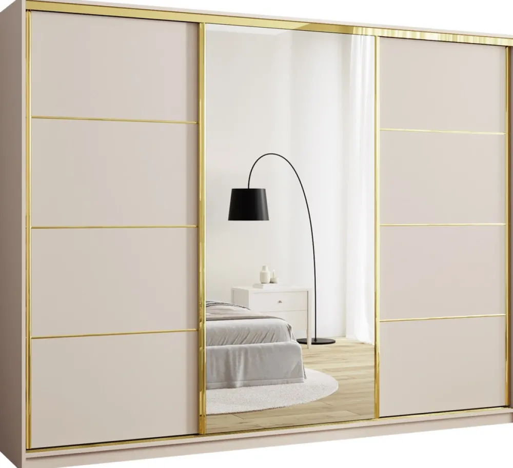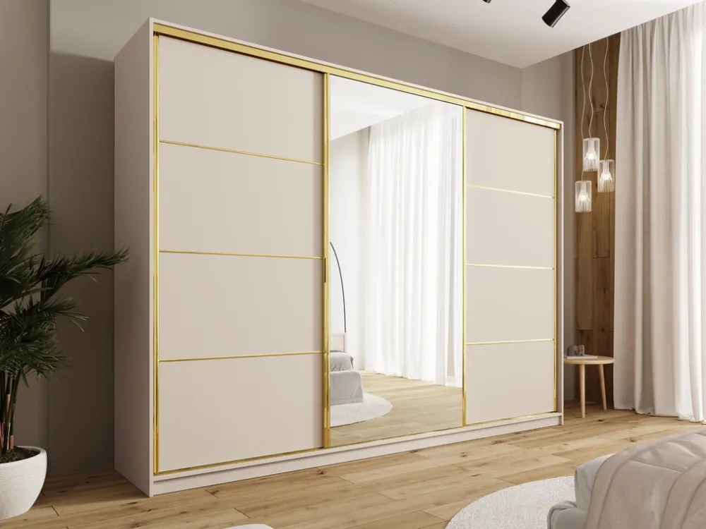 Dodaj swojej sypialni nuty luksusu i porządku dzięki eleganckiej szafie przesuwnej o szerokości 280 cm. Połączenie lustra, złotych detali i praktycznego układu wnętrza sprawia, że to idealne rozwiązanie do przechowywania ubrań, które jednocześnie staje się ozdobą wnętrza. Środkowe drzwi z lustrem optycznie powiększają przestrzeń, a złoty system przesuwny ze szprosami nadaje szafie nowoczesny, a zarazem szykowny charakter.