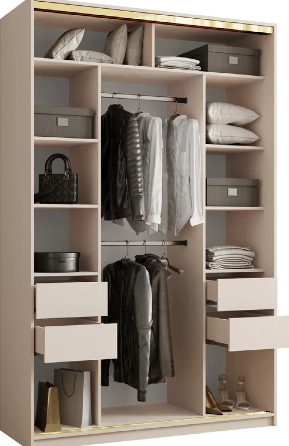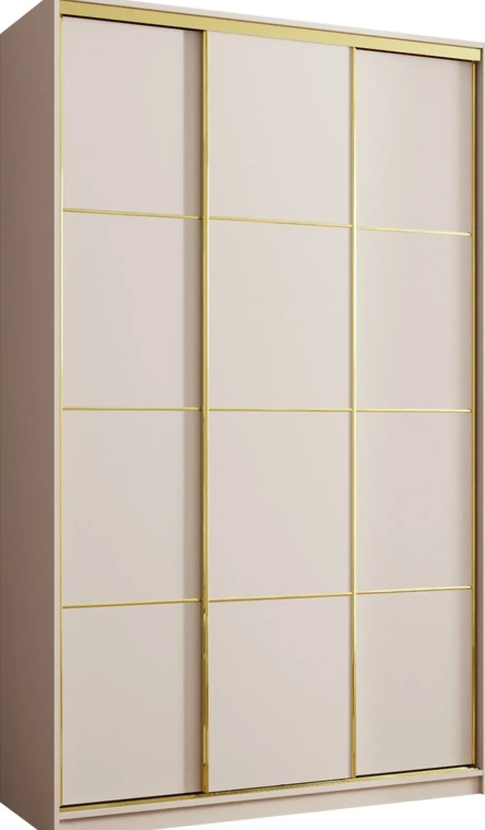 Wykończenie w kolorze złota to propozycja dla tych, którzy szukają nowoczesnego designu z nutą elegancji. Połączenie funkcjonalności i estetyki sprawia, że szafa idealnie wpisuje się zarówno w styl glamour, jak i minimalistyczne aranżacje.