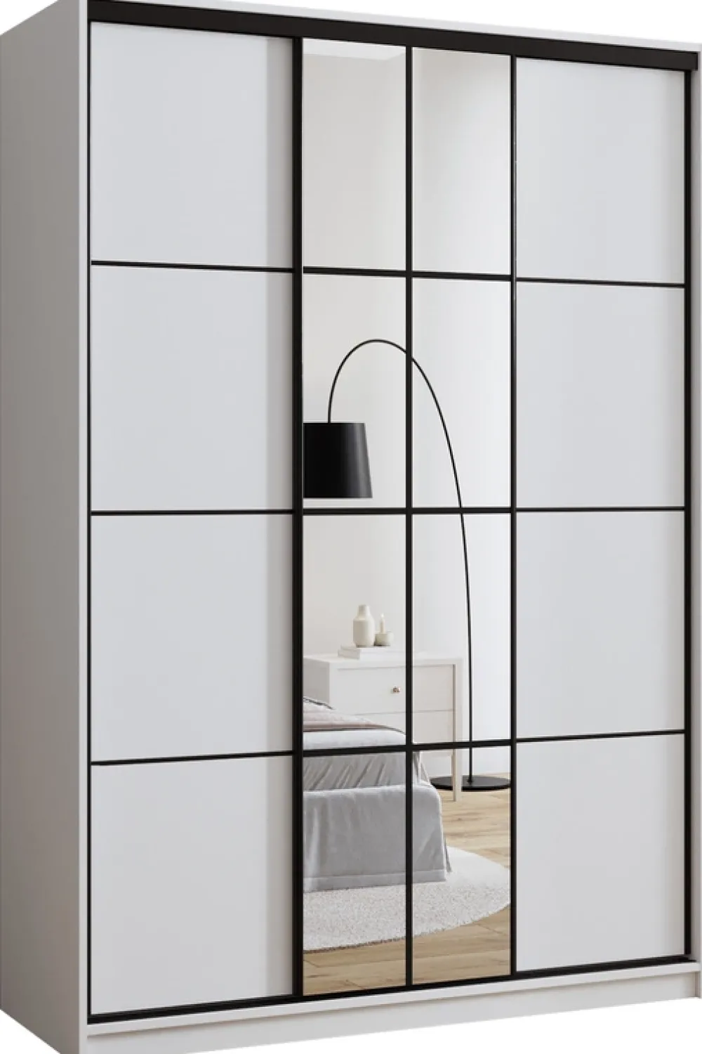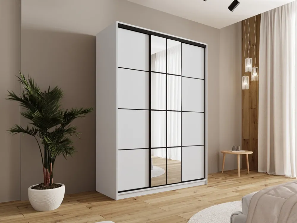 Poznaj wyjątkową szafę przesuwną z lustrem EDGE, która łączy w sobie nowoczesny design, praktyczne rozwiązania i wysoką jakość wykonania. Ten elegancki mebel to doskonałe uzupełnienie każdej sypialni, garderoby lub przedpokoju. Drzwi przesuwne poruszają się na wytrzymałym stalowym systemie w czarnym kolorze, który zapewnia płynność i trwałość użytkowania. Całość dopełniają czarne stalowe uchwyty, podkreślające nowoczesny charakter mebla.
