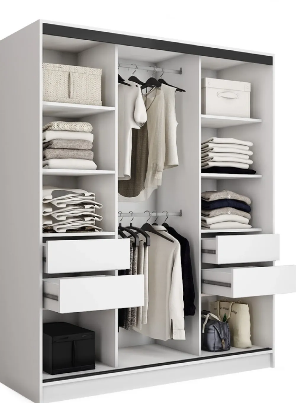 Wykonana z wysokiej jakości materiałów, ta szafa przesuwna z lustrem to nie tylko funkcjonalny mebel, ale również stylowy element wnętrza. Dzięki połączeniu przemyślanego układu półek, szuflad i drążków z eleganckim wykończeniem, stanowi idealny wybór dla osób poszukujących praktycznych i estetycznych rozwiązań w aranżacji wnętrz. Nowoczesna szafa pozwoli Ci zorganizować przestrzeń, nadając pomieszczeniu wyjątkowego charakteru.