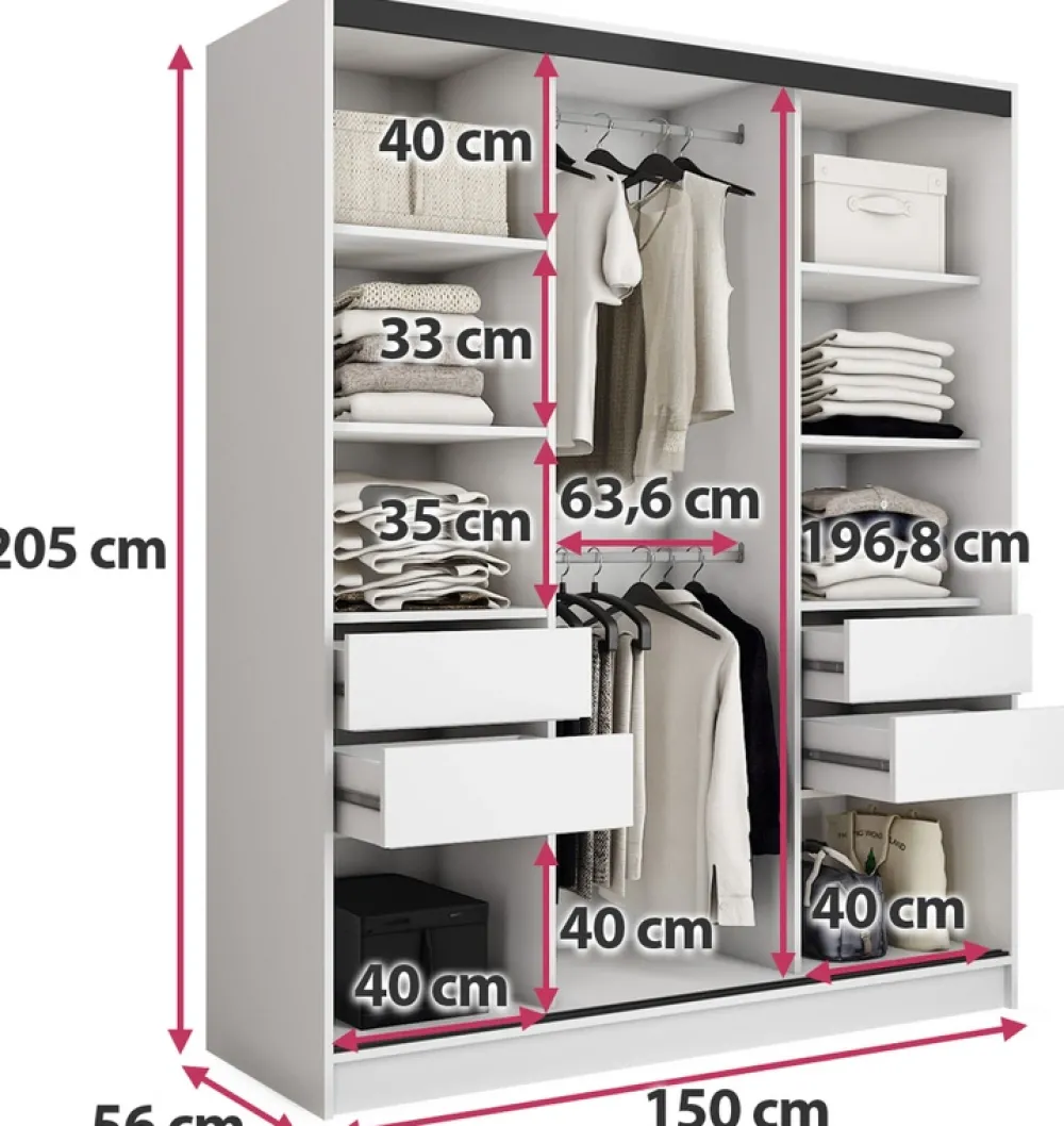- Szafa posiada dwa aluminiowe drążki na wieszaki. Celowo nie wykonujemy wierceń pod drążki na wieszaki, tak aby każdy mógł dostosować ich wysokość do własnych potrzeb.
