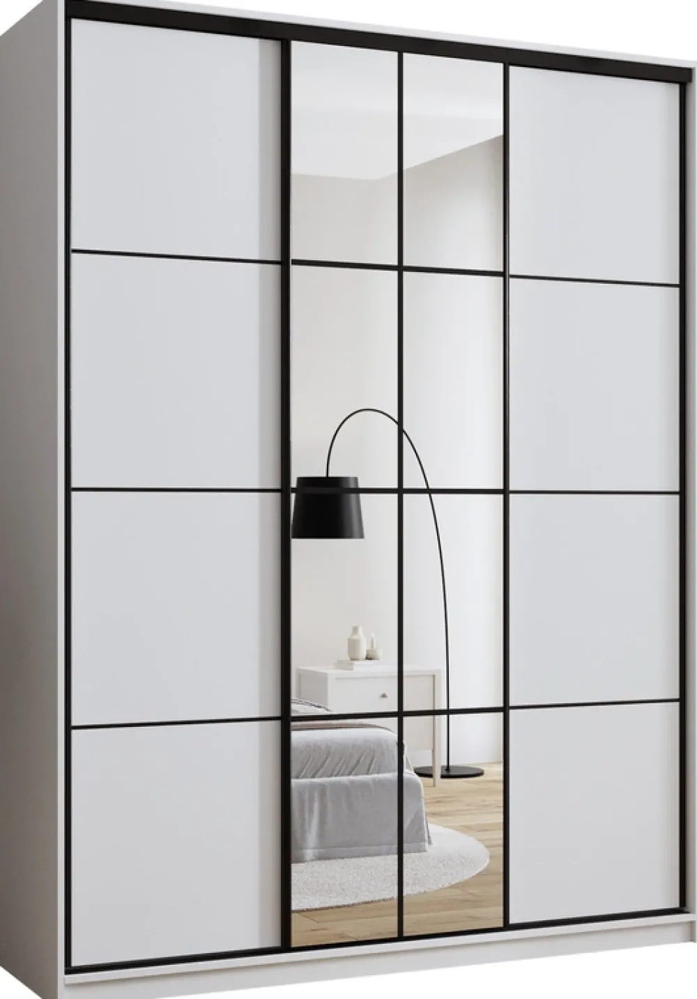 - Lustro szafy posiada dekoracyjne szprosy w czarnym kolorze o grubości 16 mm. Lustro po rozpakowaniu posiada już zamontowane szprosy.