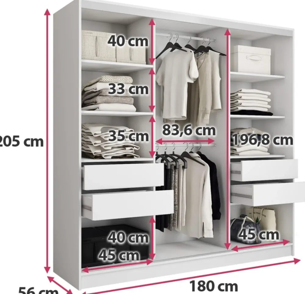 Szafa wyposażona jest w trzy drzwi przesuwne osadzone na solidnych stalowych prowadnicach. Wewnątrz znajdują się cztery przestronne szuflady na kulkowych prowadnicach, idealne do przechowywania drobniejszych przedmiotów, a także cztery poziomy półek po prawej i lewej stronie, co umożliwia zorganizowane przechowywanie odzieży i innych akcesoriów.