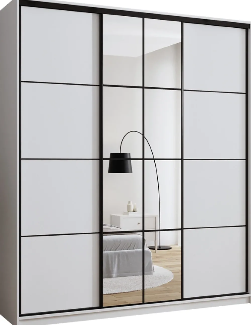 Na środku szafy znajduje się duże lustro, które optycznie powiększa przestrzeń i odbija światło, nadając wnętrzu lekkości. To praktyczny element, który pozwoli Ci wygodnie sprawdzić swoją stylizację i rozjaśni każde pomieszczenie.