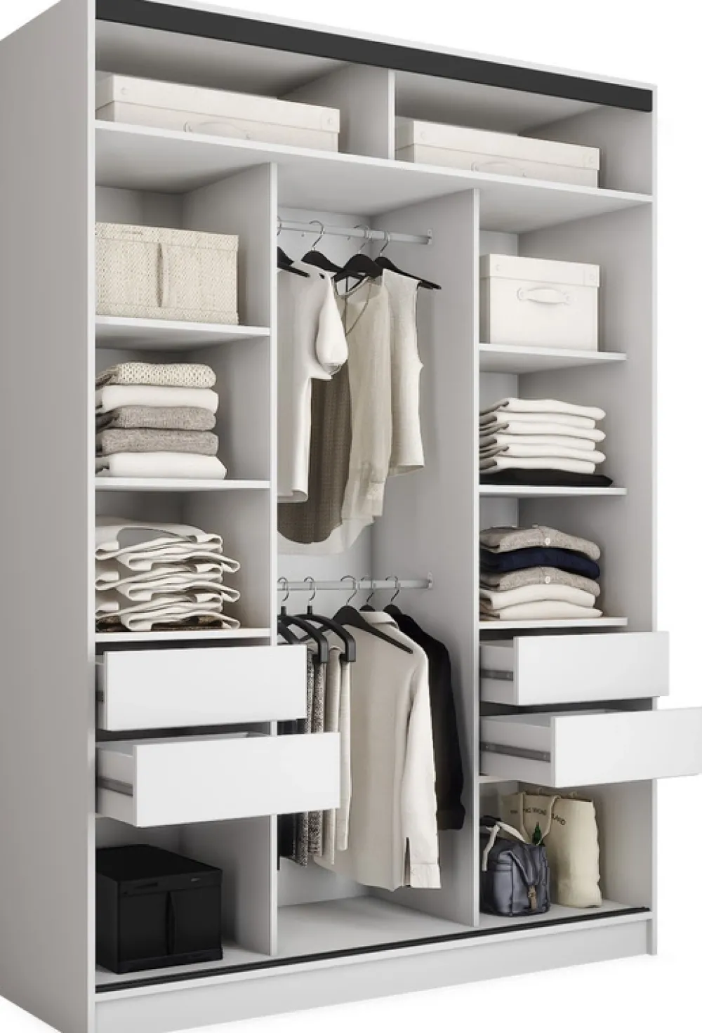 Wnętrze szafy oferuje doskonałą organizację. Po lewej i prawej stronie znajdują się cztery przestronne półki oraz dwie praktyczne szuflady, które pomieszczą ubrania, akcesoria i inne przedmioty codziennego użytku. Środkowa część została wyposażona w aluminiowe drążki na wieszaki, które są idealne na długie płaszcze, marynarki czy sukienki.