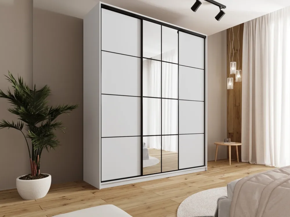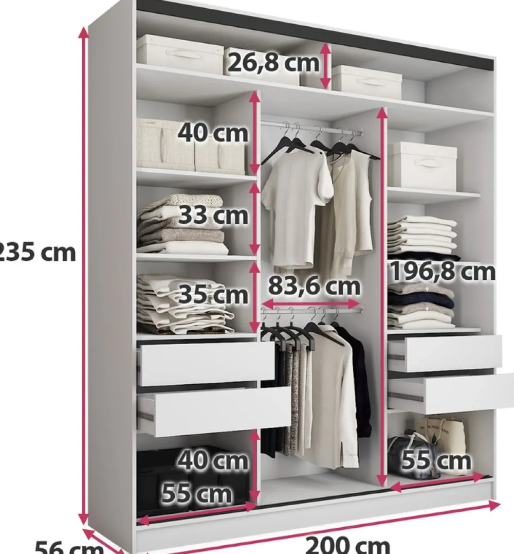 Dodatkowym atutem są krawędzie wykończone trwałą okleiną ABS, która chroni mebel przed uszkodzeniami i zwiększa jego odporność na codzienne użytkowanie. Szafa przesuwna 200 cm łączy w sobie funkcjonalność, pojemność i nowoczesny styl, stając się wyjątkowym elementem każdego wnętrza.