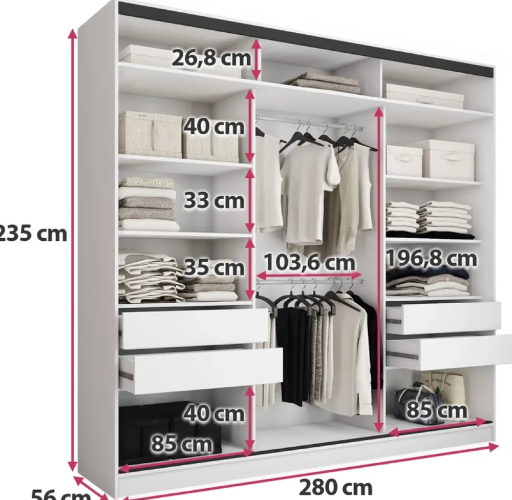 Nasza szafa przesuwna 280 cm to doskonałe połączenie stylu, przestronności i funkcjonalności. Wybierz mebel, który nie tylko pomoże Ci zorganizować przestrzeń, ale także doda elegancji Twojemu wnętrzu. Inwestując w tę szafę, wybierasz jakość, komfort i nowoczesny design. Spraw, aby Twoje wnętrze stało się miejscem, gdzie funkcjonalność spotyka się z estetyką na najwyższym poziomie.