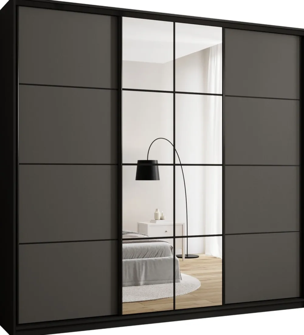 Szafa przesuwna o szerokości 250 cm to idealne rozwiązanie do dużych przestrzeni, które wymagają przemyślanej organizacji i nowoczesnego stylu. Wyposażona w stalowy system przesuwny w czarnym kolorze, zapewnia nie tylko płynną i cichą pracę, ale także podkreśla jej industrialny, modny charakter.