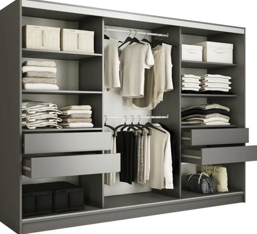 Wnętrze szafy zostało zaprojektowane z myślą o maksymalnym wykorzystaniu przestrzeni i wygodzie użytkowania. Znajdziesz tu cztery półki oraz dwie szuflady po prawej i lewej stronie, które umożliwiają wygodne przechowywanie ubrań, bielizny oraz innych akcesoriów. Centralna część szafy kryje dwa solidne metalowe drążki, które idealnie nadają się do wieszania odzieży, zapewniając łatwy dostęp i porządek.