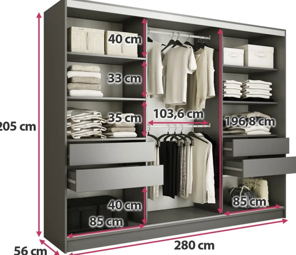 - Szafa przesuwna z lustrem 280 cm TOP posiada cztery głębokie szuflady oraz osiem półek i cztery szuflady. Drzwi szafy poruszają się na metalowej prowadnicy w srebrnym kolorze, która dodatkowo usztywnia konstrukcję.
