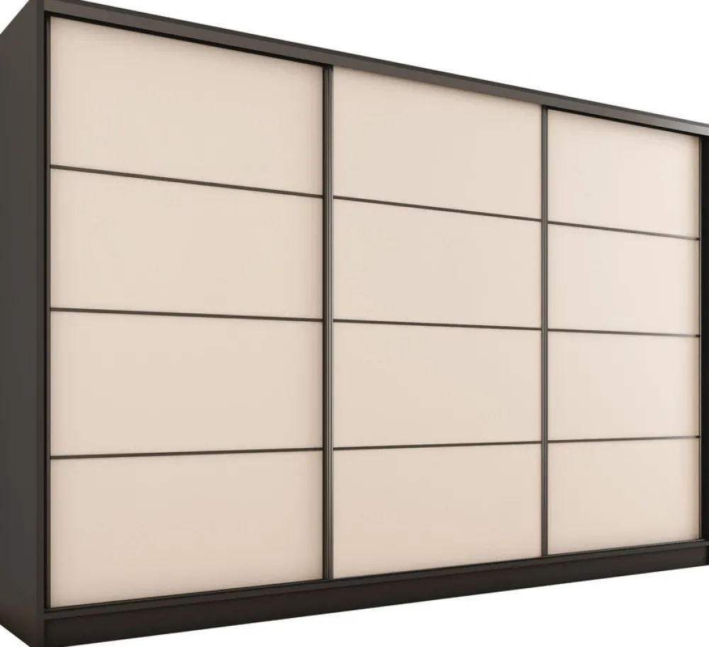 - Elegancka szafa przesuwna LOFT o szerokości 280 cm, z korpusem w kolorze czarnym i froncie w odcieniu beżu piaskowego. Wykonana z 16 mm płyty laminowanej, krawędzie zabezpieczone okleiną ABS. W zestawie listwy ozdobne do samodzielnego naklejenia.