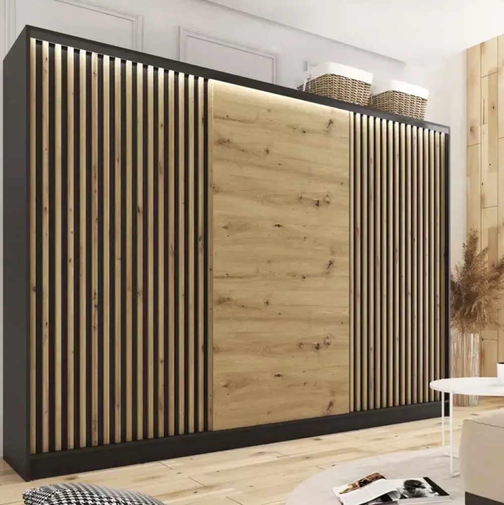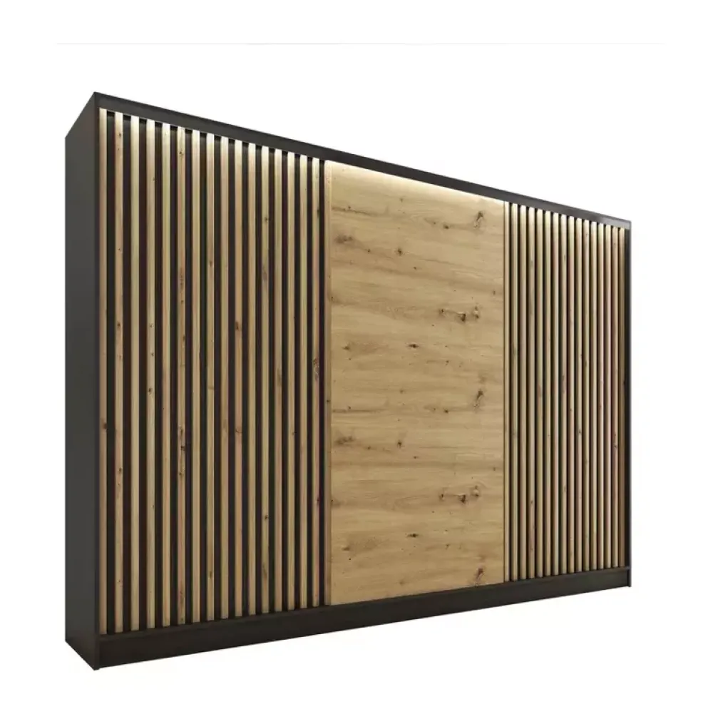 Szafa przesuwna LOFT 280 cm to doskonały wybór dla miłośników nowoczesnego designu i praktycznych rozwiązań. Jej unikalne lamelowe fronty wprowadzają industrialny charakter, który świetnie wpisuje się w styl loftowy, dodając wnętrzu wyrazistości i elegancji.