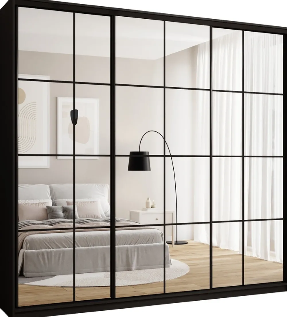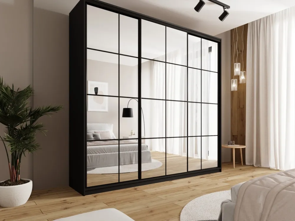 Szafa przesuwna o szerokości 250 cm OPTICA MAX to mebel, który łączy nowoczesny design z wyjątkową praktycznością. Stalowy system przesuwny w czarnym kolorze zapewnia płynne i ciche otwieranie drzwi, podkreślając elegancję i minimalistyczny charakter szafy. Jej trzy drzwi w całości pokryte lustrem nie tylko dodają wnętrzu klasy, ale także optycznie powiększają przestrzeń, wprowadzając do pomieszczenia więcej światła.