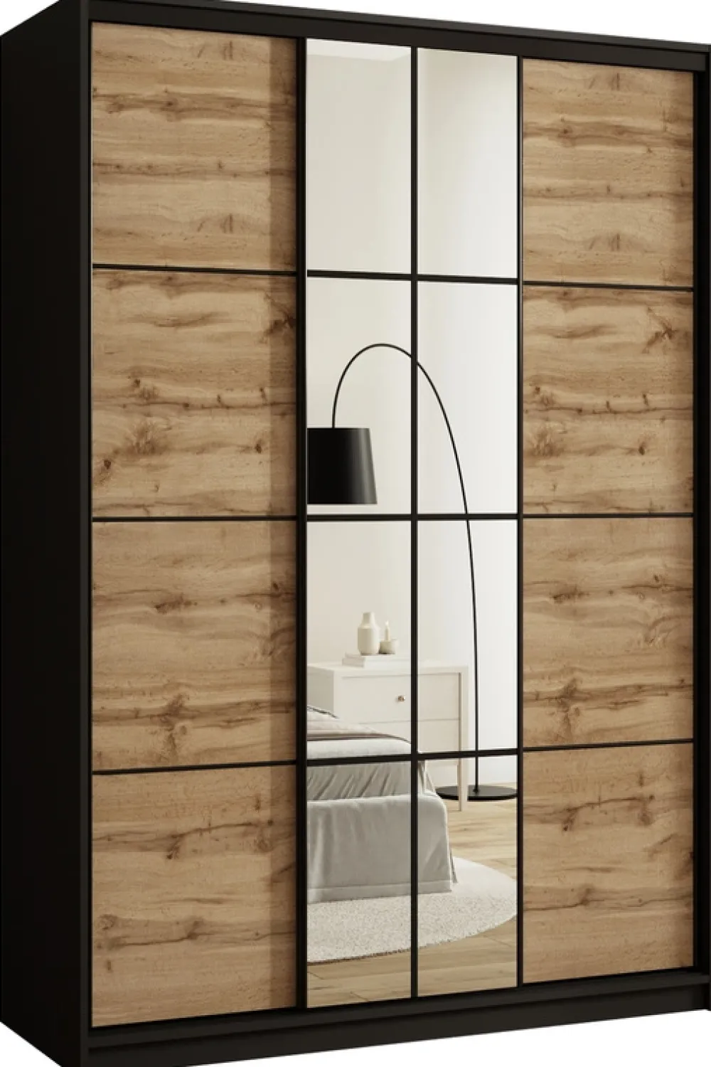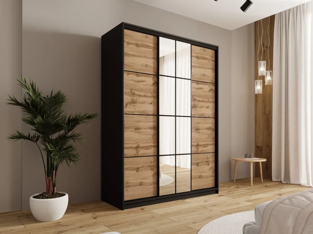 Poznaj wyjątkową szafę przesuwną z lustrem EDGE, która łączy w sobie nowoczesny design, praktyczne rozwiązania i wysoką jakość wykonania. Ten elegancki mebel to doskonałe uzupełnienie każdej sypialni, garderoby lub przedpokoju. Drzwi przesuwne poruszają się na wytrzymałym stalowym systemie w czarnym kolorze, który zapewnia płynność i trwałość użytkowania. Całość dopełniają czarne stalowe uchwyty, podkreślające nowoczesny charakter mebla.