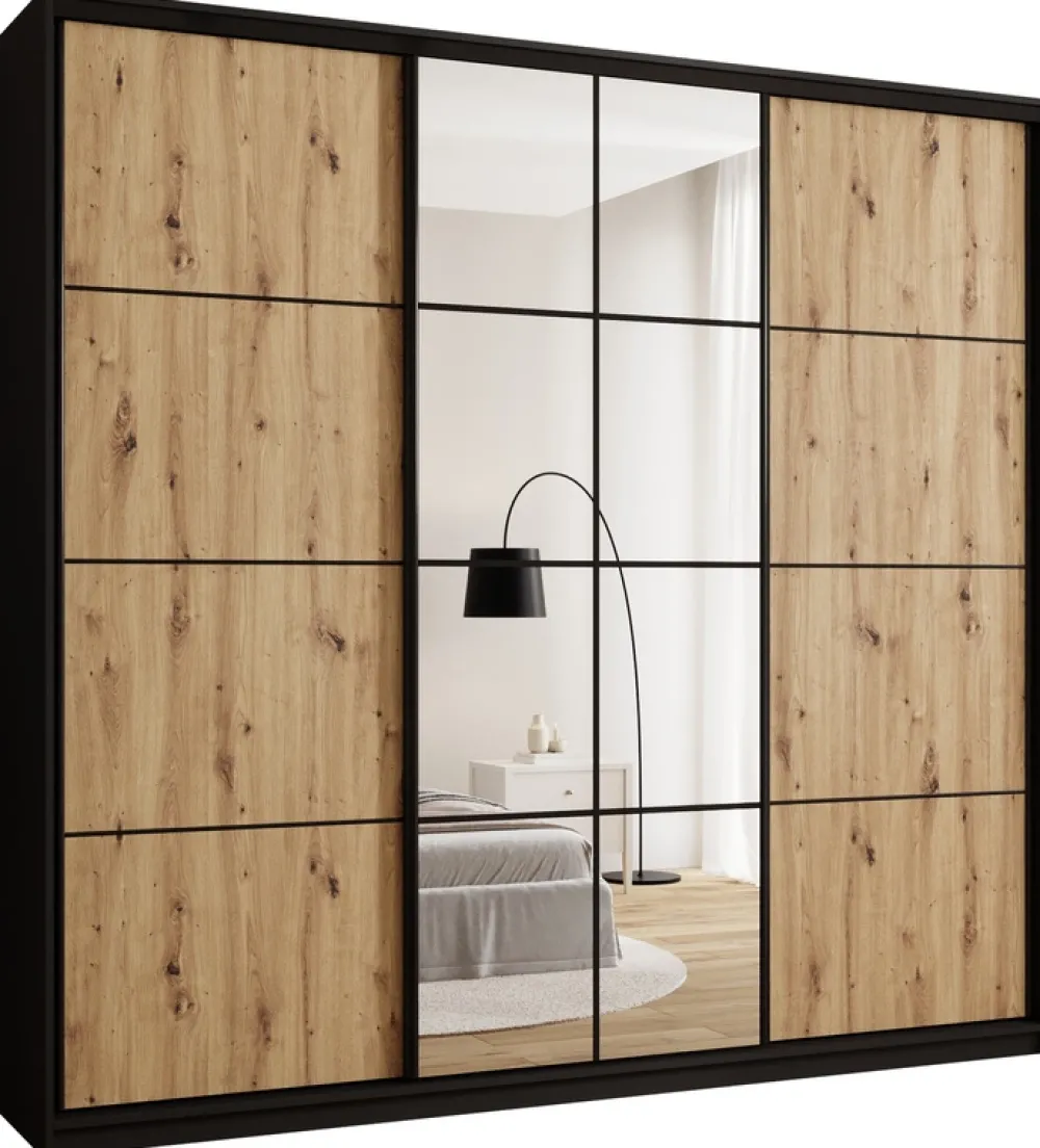 Szafa przesuwna o szerokości 250 cm to idealne rozwiązanie do dużych przestrzeni, które wymagają przemyślanej organizacji i nowoczesnego stylu. Wyposażona w stalowy system przesuwny w czarnym kolorze, zapewnia nie tylko płynną i cichą pracę, ale także podkreśla jej industrialny, modny charakter.