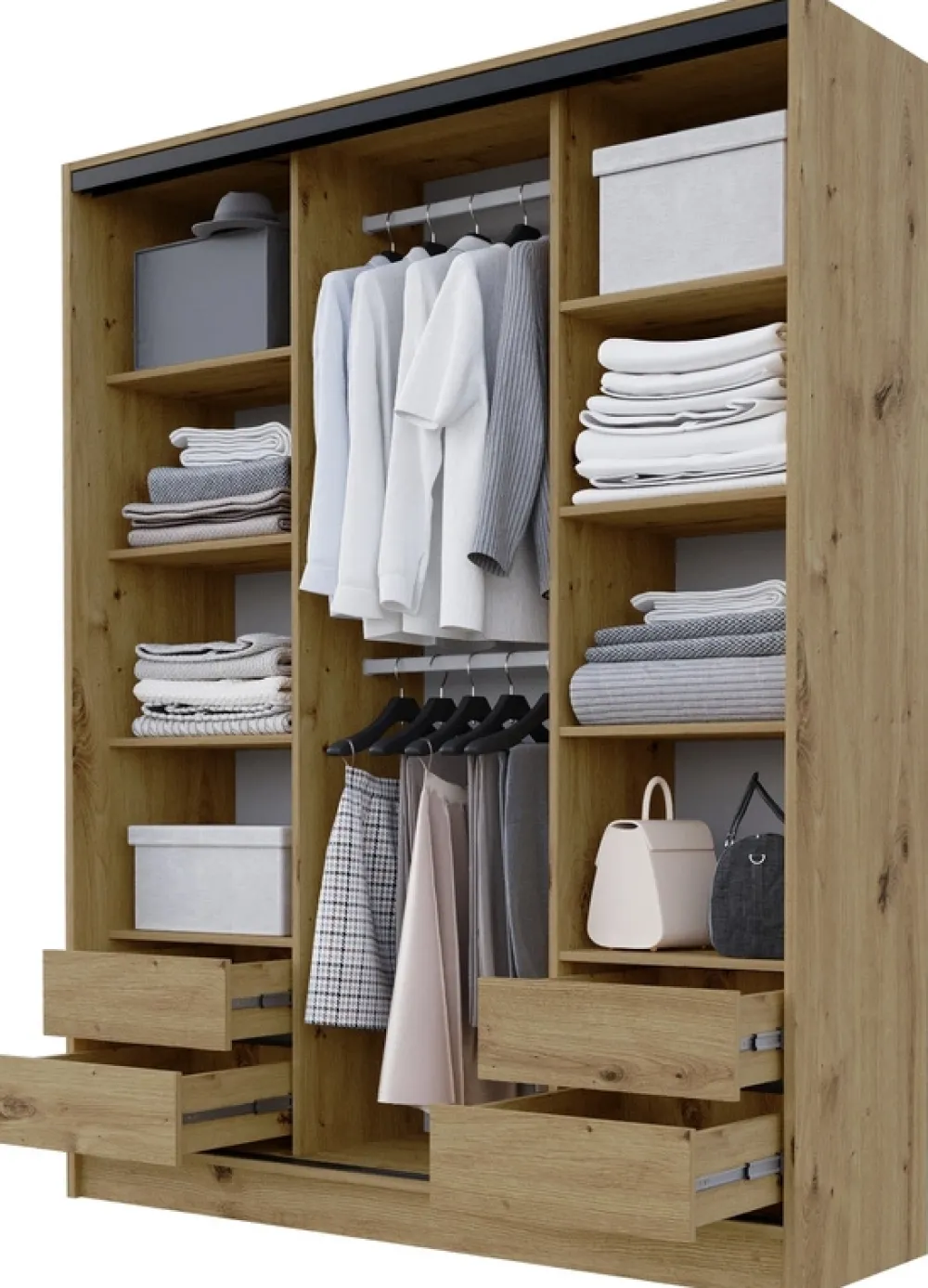 Wewnątrz szafy znajduje się aż osiem półek, które oferują mnóstwo miejsca na przechowywanie ubrań i innych przedmiotów. Cztery szuflady zapewniają dodatkową przestrzeń na drobniejsze akcesoria, gwarantując łatwy dostęp i porządek.
