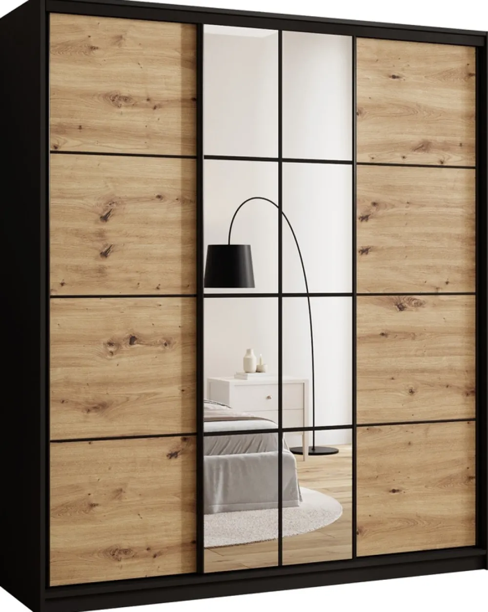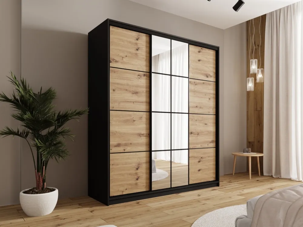 Szafa wyposażona jest w trzy drzwi przesuwne, które poruszają się na czarnym stalowym systemie przesuwnym, gwarantując płynne i ciche działanie. Czarne stalowe uchwyty dodają całości nowoczesnego charakteru, a wysokiej jakości materiały zapewniają trwałość i solidność mebla.