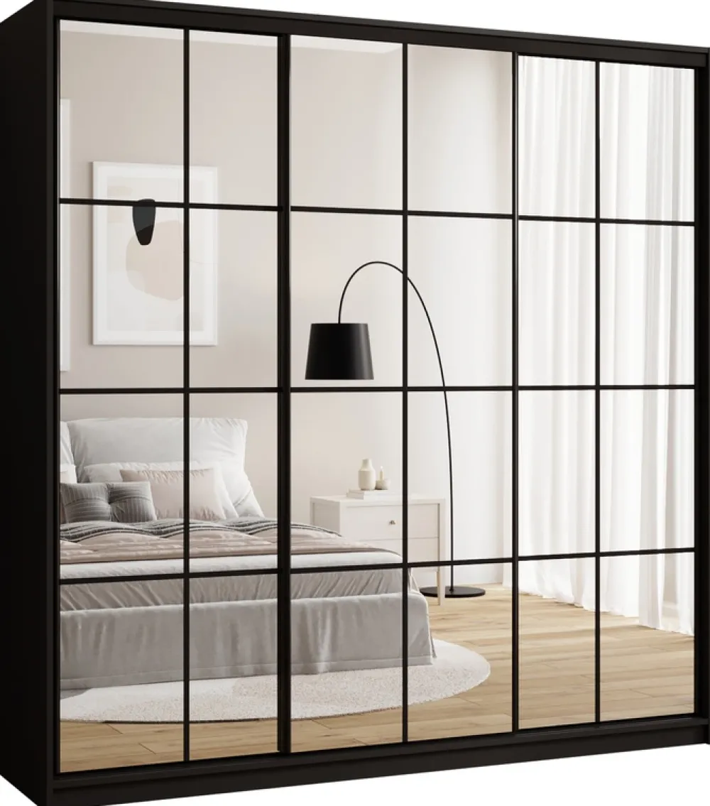 Trzy przesuwne drzwi z lustrzanymi frontami to nie tylko praktyczne rozwiązanie, ale także element, który dodaje wnętrzu wyjątkowego charakteru. Lustra optycznie powiększają przestrzeń, wprowadzając do pomieszczenia więcej światła. Czarny stalowy system przesuwny oraz czarne stalowe uchwyty nadają szafie nowoczesnego, minimalistycznego stylu, idealnego do współczesnych wnętrz.