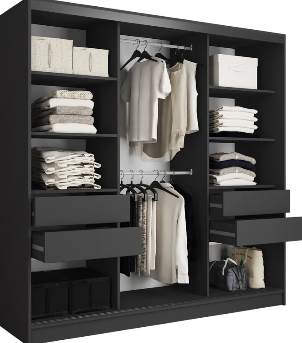 Szafa została zaprojektowana z myślą o maksymalnym wykorzystaniu przestrzeni. Po lewej i prawej stronie znajdują się cztery pojemne półki, które zapewniają miejsce na ubrania, akcesoria czy pościel. Dwie szuflady na prowadnicach kulkowych to idealne miejsce na przechowywanie mniejszych przedmiotów – łatwy dostęp i płynne otwieranie zapewniają wygodę codziennego użytkowania.