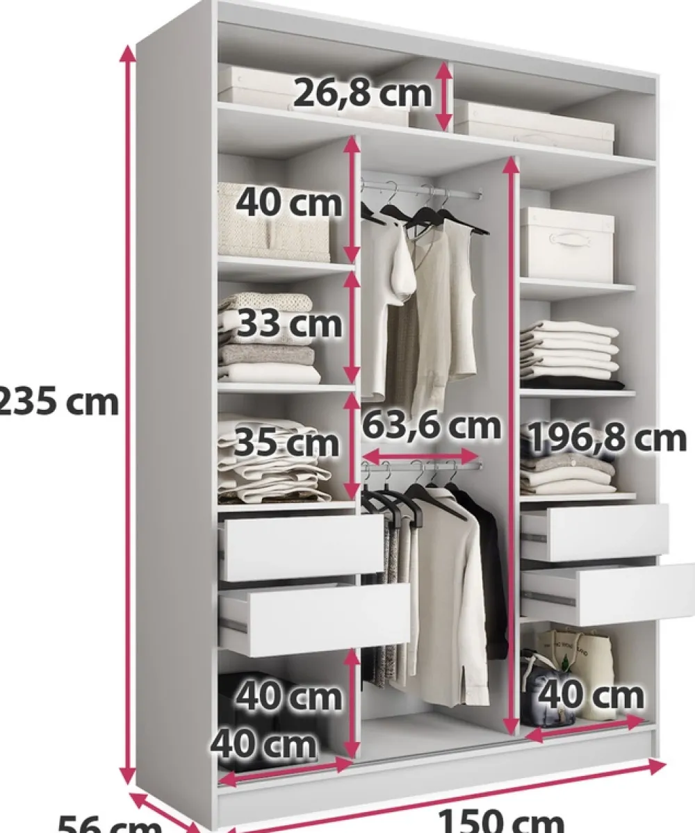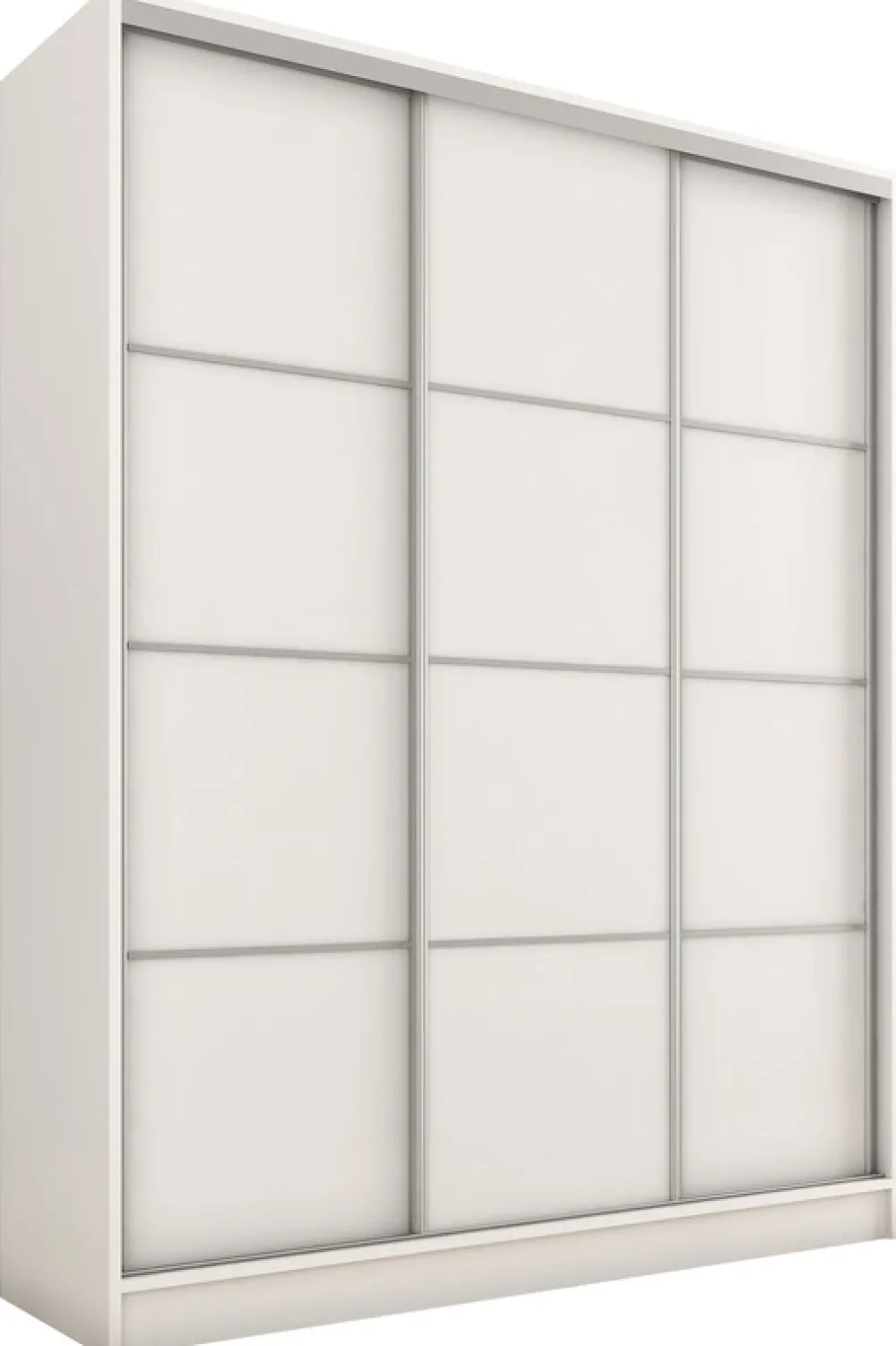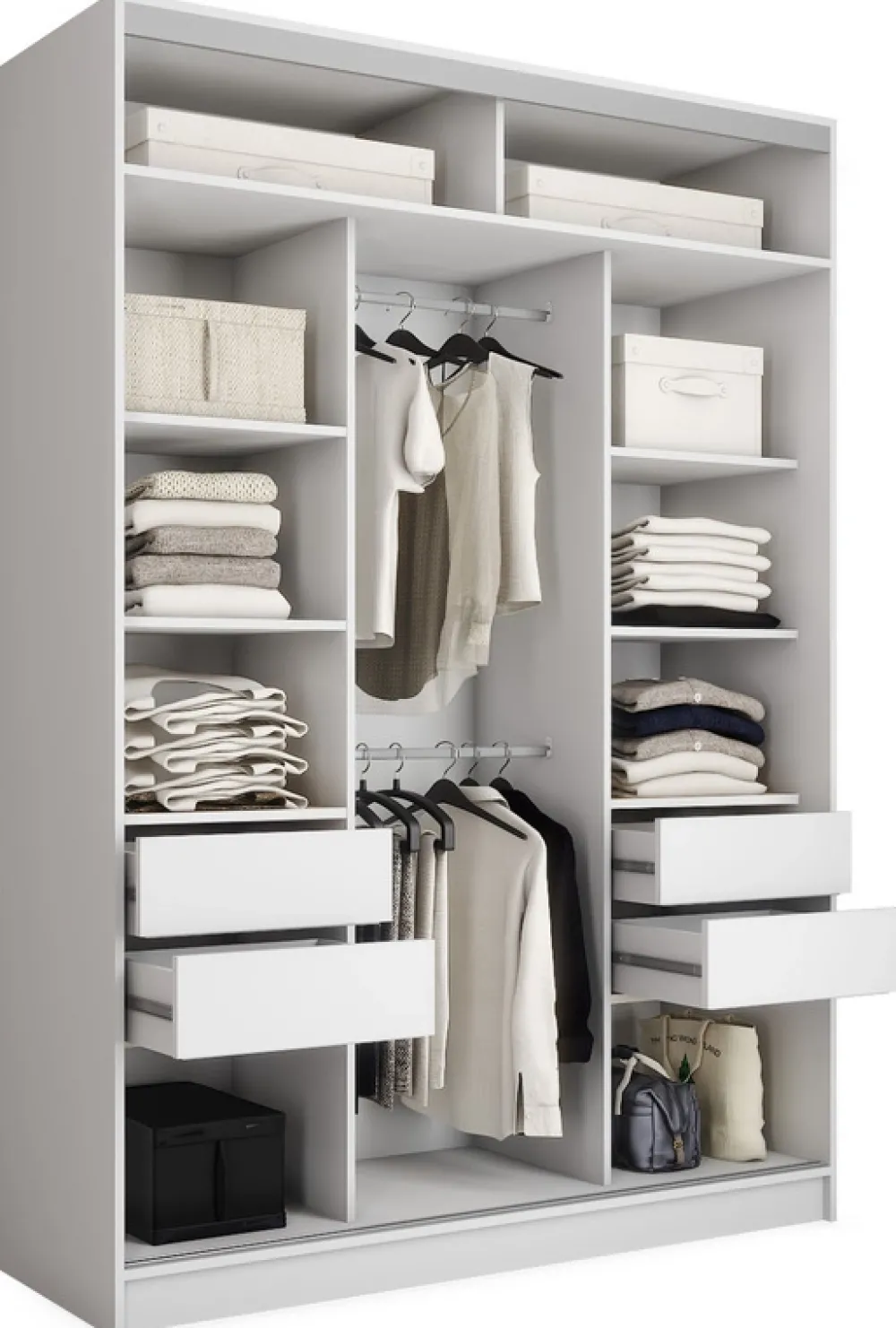 - Biała szafa przesuwna 150 cm TOP MAX posiada trzy drzwi osadzone na stalowej prowadnicy w srebrnym kolorze. Za drzwiami znajdują się liczne półki, cztery głębokie szuflad oraz dwa metalowe drążki na wieszaki z ubraniami.