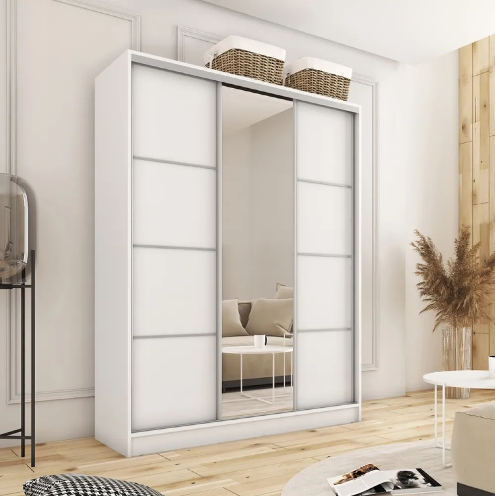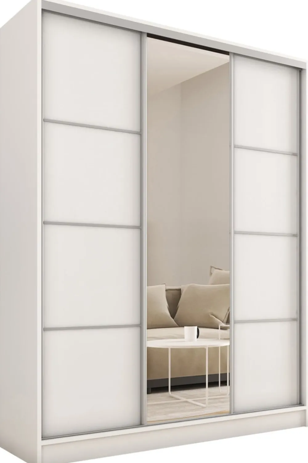 Nowoczesna biała szafa przesuwna z lustrem 150 cm TOP MAX to idealne rozwiązanie dla osób poszukujących eleganckiego i praktycznego mebla. Dzięki przemyślanemu układowi wnętrza oraz nowoczesnemu designowi szafa przesuwna doskonale wpisuje się w każde wnętrze, oferując nie tylko dużo miejsca na przechowywanie, ale także wizualnie powiększając przestrzeń dzięki lustru na środkowych drzwiach.