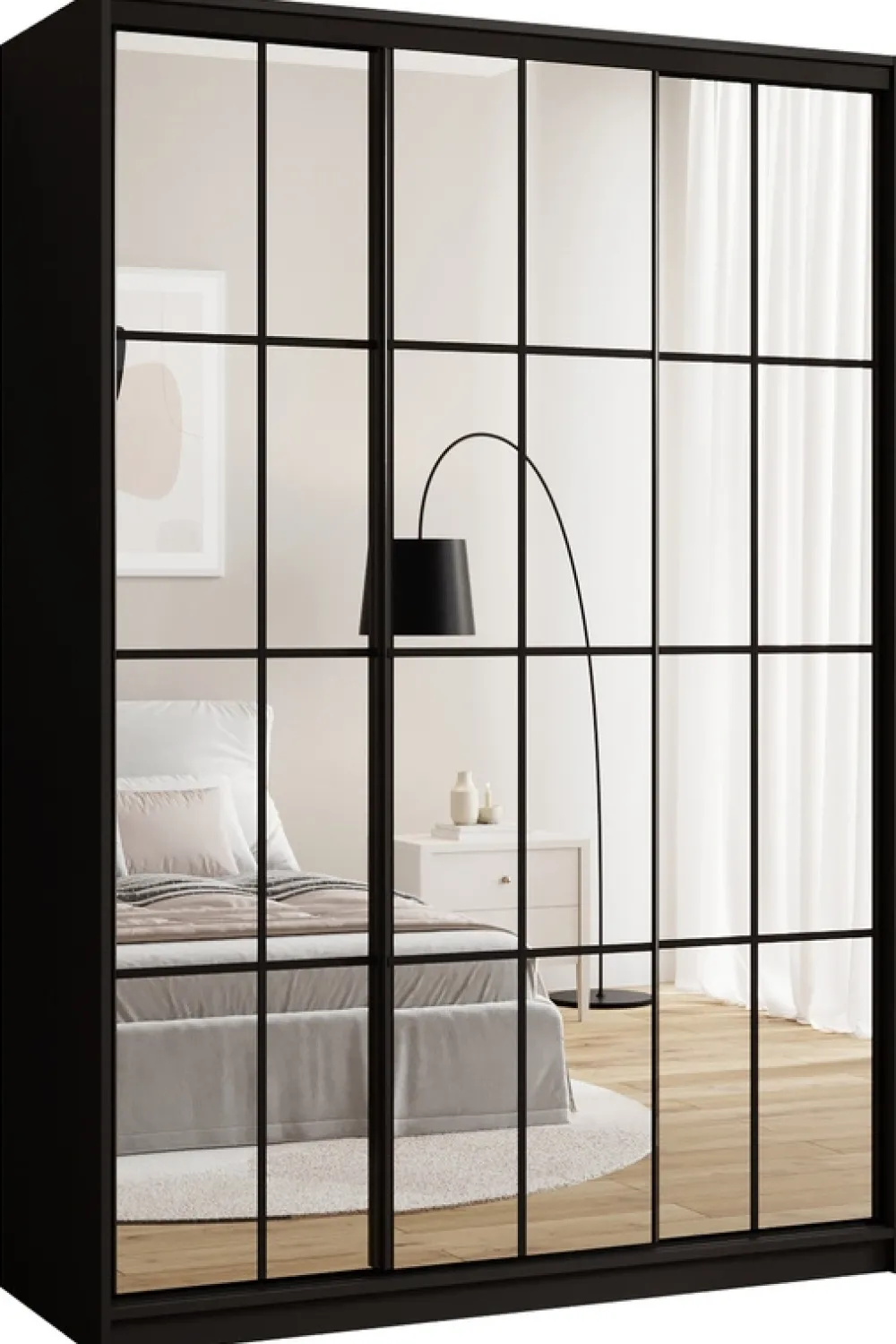 Szafa wyposażona jest w trzy przesuwne drzwi, które w całości wykonano z luster. Taka konstrukcja optycznie powiększa przestrzeń, dodając pomieszczeniu lekkości i nowoczesności. Czarne stalowe uchwyty oraz stalowy system przesuwny w czarnym kolorze nie tylko podkreślają elegancję mebla, ale także zapewniają trwałość i wygodę użytkowania.