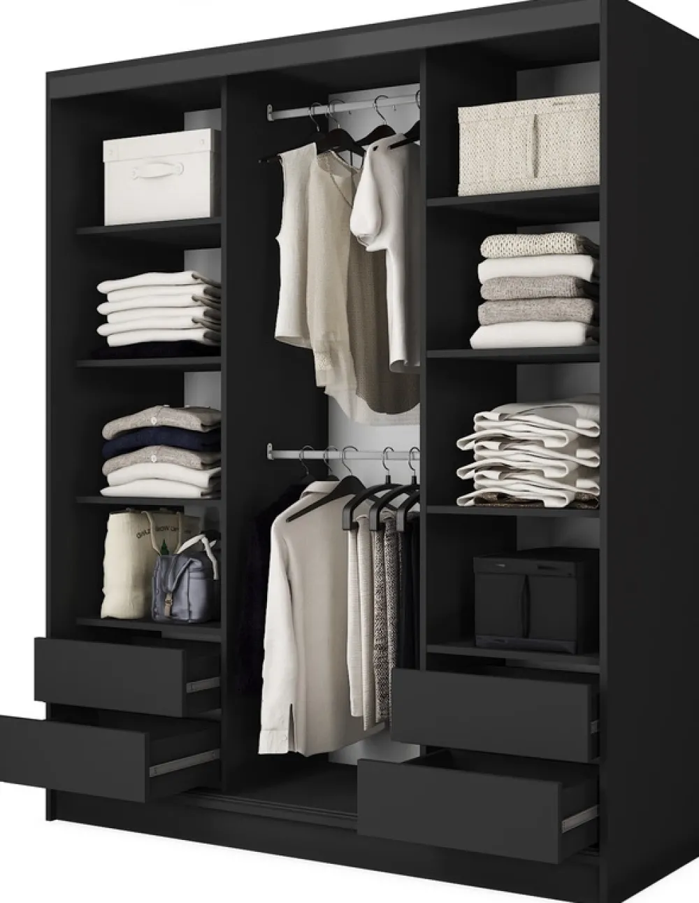 - Szafa przesuwna BEST posiada 160 cm szerokości, które obejmują osiem przestronnych półek, dwa aluminiowe drążki na wieszaki oraz cztery głębokie szuflady. Drzwi szafy poruszają się na solidnym, aluminiowym systemie przesuwnym w czarnym kolorze.