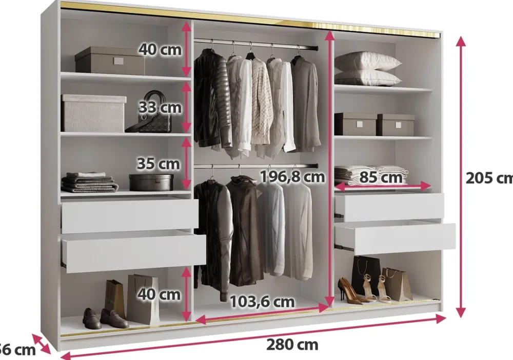 Dodaj swojej sypialni nuty luksusu i porządku dzięki eleganckiej szafie przesuwnej o szerokości 280 cm. Połączenie lustra, złotych detali i praktycznego układu wnętrza sprawia, że to idealne rozwiązanie do przechowywania ubrań, które jednocześnie staje się ozdobą wnętrza. Środkowe drzwi z lustrem optycznie powiększają przestrzeń, a złoty system przesuwny ze szprosami nadaje szafie nowoczesny, a zarazem szykowny charakter.