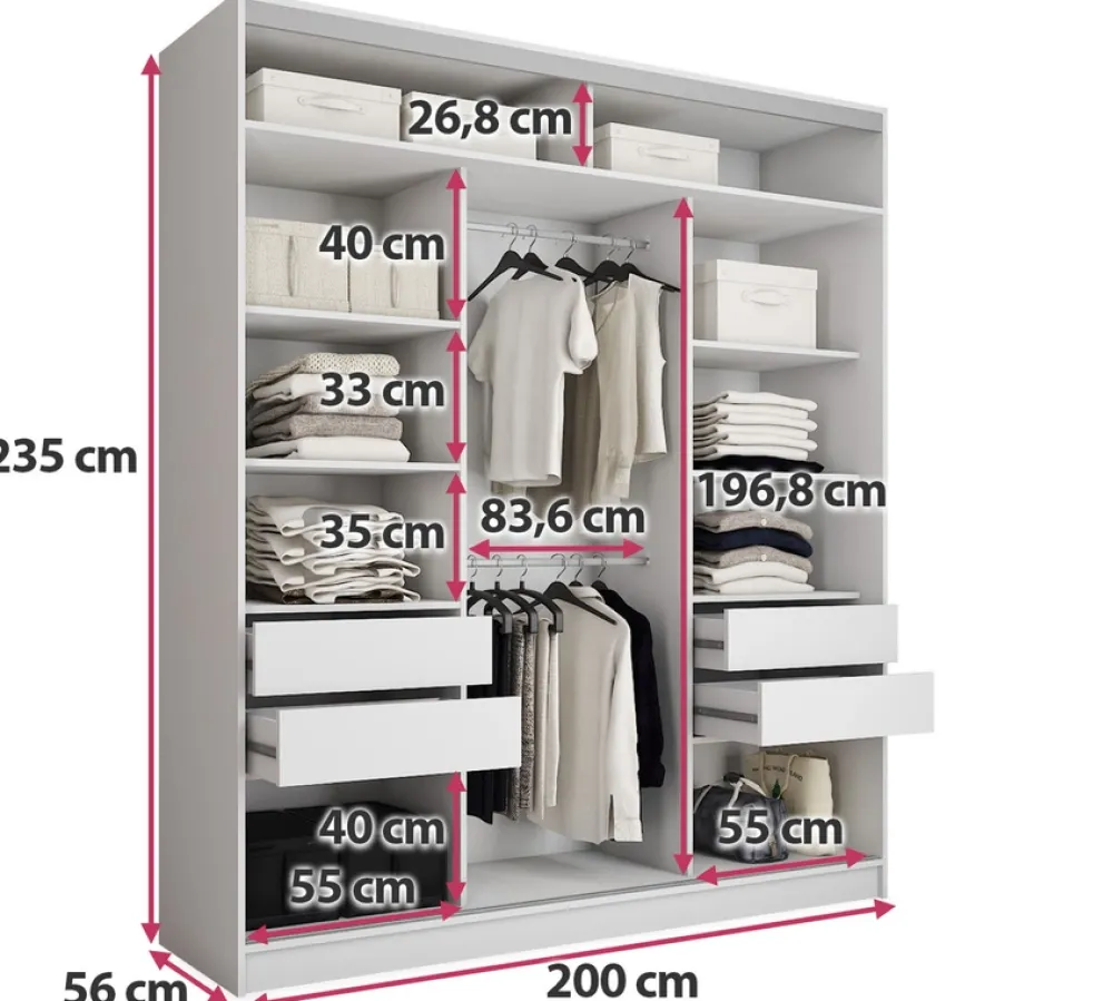 Szafa przesuwna do sypialni 200 cm TOP MAX jest doskonałym rozwiązaniem do różnych pomieszczeń. Jej przestronne wnętrze oraz przemyślany układ półek i szuflad pozwalają na wygodne przechowywanie ubrań, butów, akcesoriów oraz innych przedmiotów. Dzięki trzem przesuwnym drzwiom, szafa nie tylko ułatwia organizację przestrzeni, ale również pełni rolę dekoracyjnego elementu wnętrza.