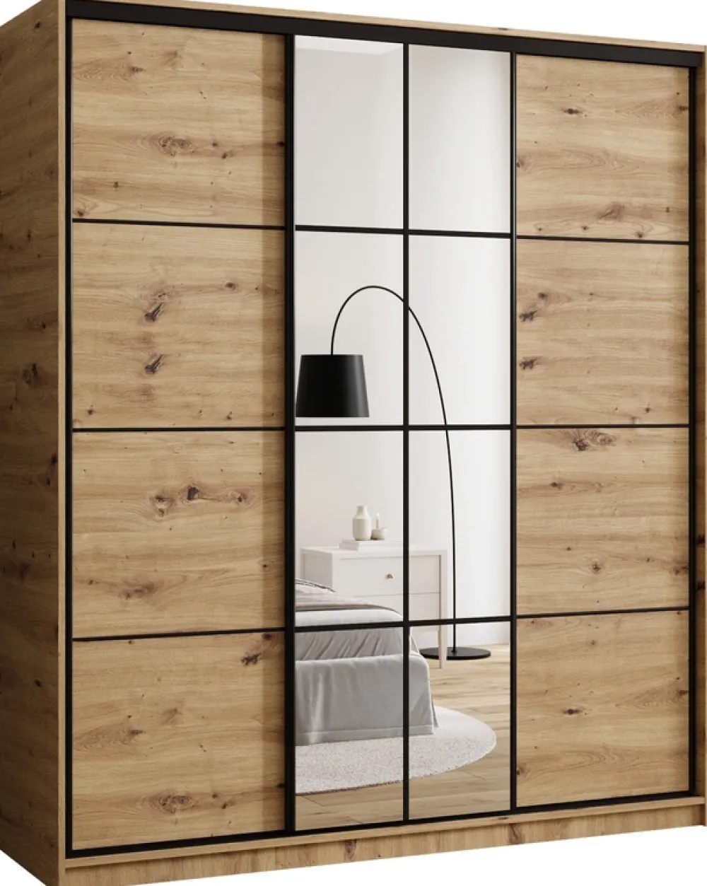 Szafa wyposażona jest w trzy drzwi przesuwne, które poruszają się na czarnym stalowym systemie przesuwnym, gwarantując płynne i ciche działanie. Czarne stalowe uchwyty dodają całości nowoczesnego charakteru, a wysokiej jakości materiały zapewniają trwałość i solidność mebla.