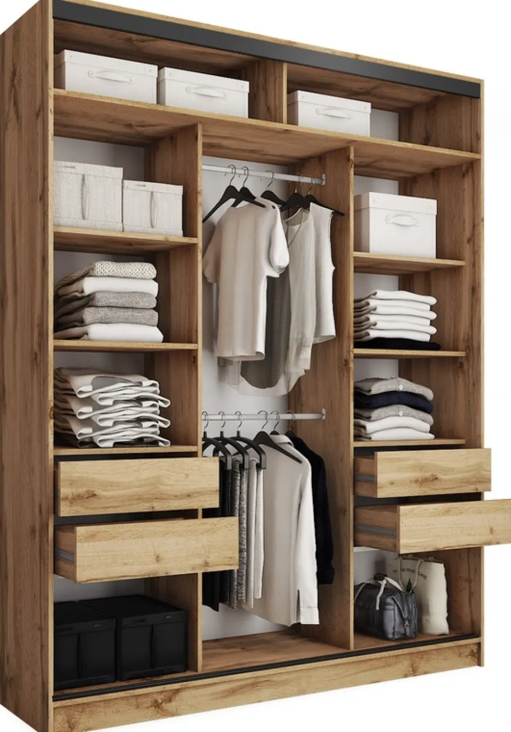 Cztery szuflady umieszczone po prawej i lewej części szafy są wyposażone w prowadnice kulkowe, co gwarantuje płynne i ciche otwieranie. Są idealne do przechowywania mniejszych przedmiotów, takich jak bielizna, akcesoria czy dokumenty. Dzięki nim, każdy drobiazg będzie miał swoje miejsce, a Ty będziesz cieszyć się porządkiem.