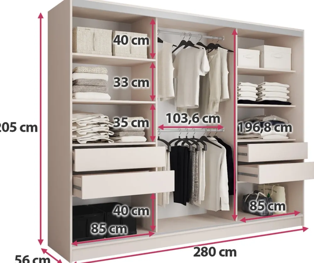 - Szafa przesuwna z lustrem 280 cm TOP posiada lustro umieszczone na środkowych drzwiach, które optyczne powiększa oraz rozjaśnia pomieszczenie. Szafa posiada dwa drążki na wieszaki oraz osiem półek i cztery szuflady.
