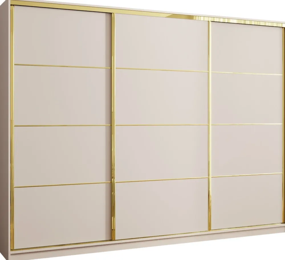 Wprowadź do swojego wnętrza elegancję i perfekcyjny porządek dzięki szafie przesuwnej o szerokości 280 cm. To mebel stworzony z myślą o praktycznym przechowywaniu, ale z wyraźnym akcentem estetycznym. Złoty stalowy system przesuwny oraz subtelne złote szprosy nadają szafie nowoczesnego, luksusowego charakteru, który doskonale wpisuje się w modne aranżacje wnętrz.