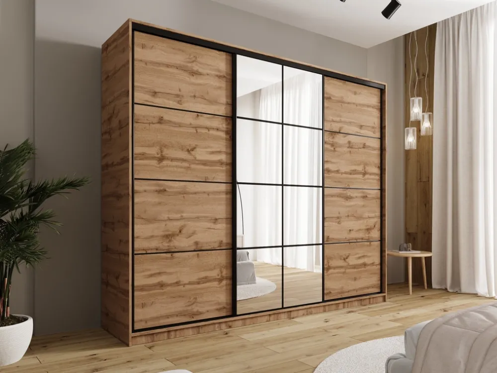 Szafa posiada trzy drzwi przesuwne wykonane na solidnym stalowym systemie w eleganckim czarnym kolorze. Czarne stalowe uchwyty dodają meblowi nowoczesnego charakteru, jednocześnie zapewniając trwałość i wygodę użytkowania. Przesuwne drzwi oszczędzają miejsce w pomieszczeniu, co jest szczególnie ważne w mniejszych sypialniach.