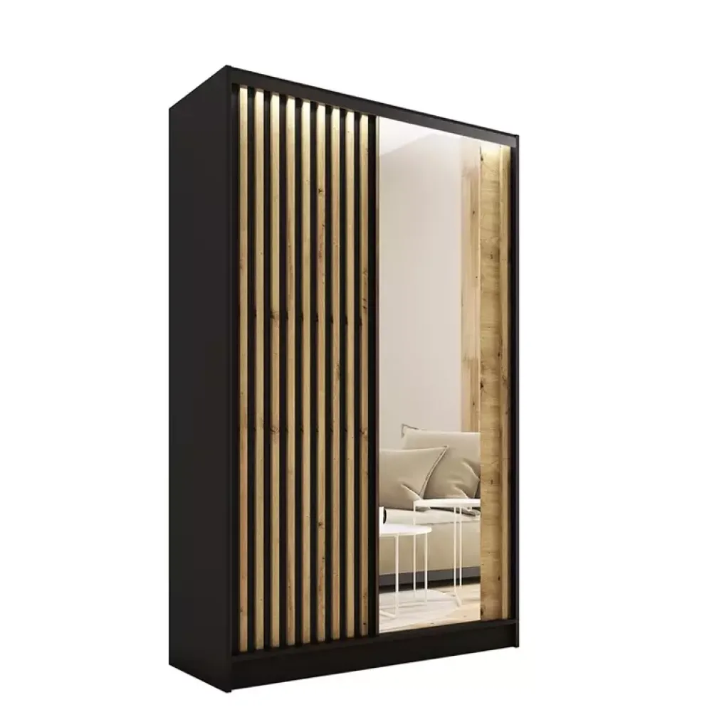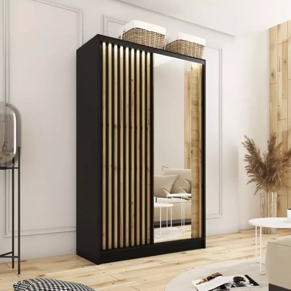 - Szafa przesuwna o szerokości 120 cm z wnętrzem zaaranżowanym z nastawieniem na jak największą swobodę użytkowania. Cztery duże półki, dwie szerokie szuflady oraz dwa drążki do samodzielnego nawiercenia, aby każdy mógł dopasować szafę do swoich potrzeb!