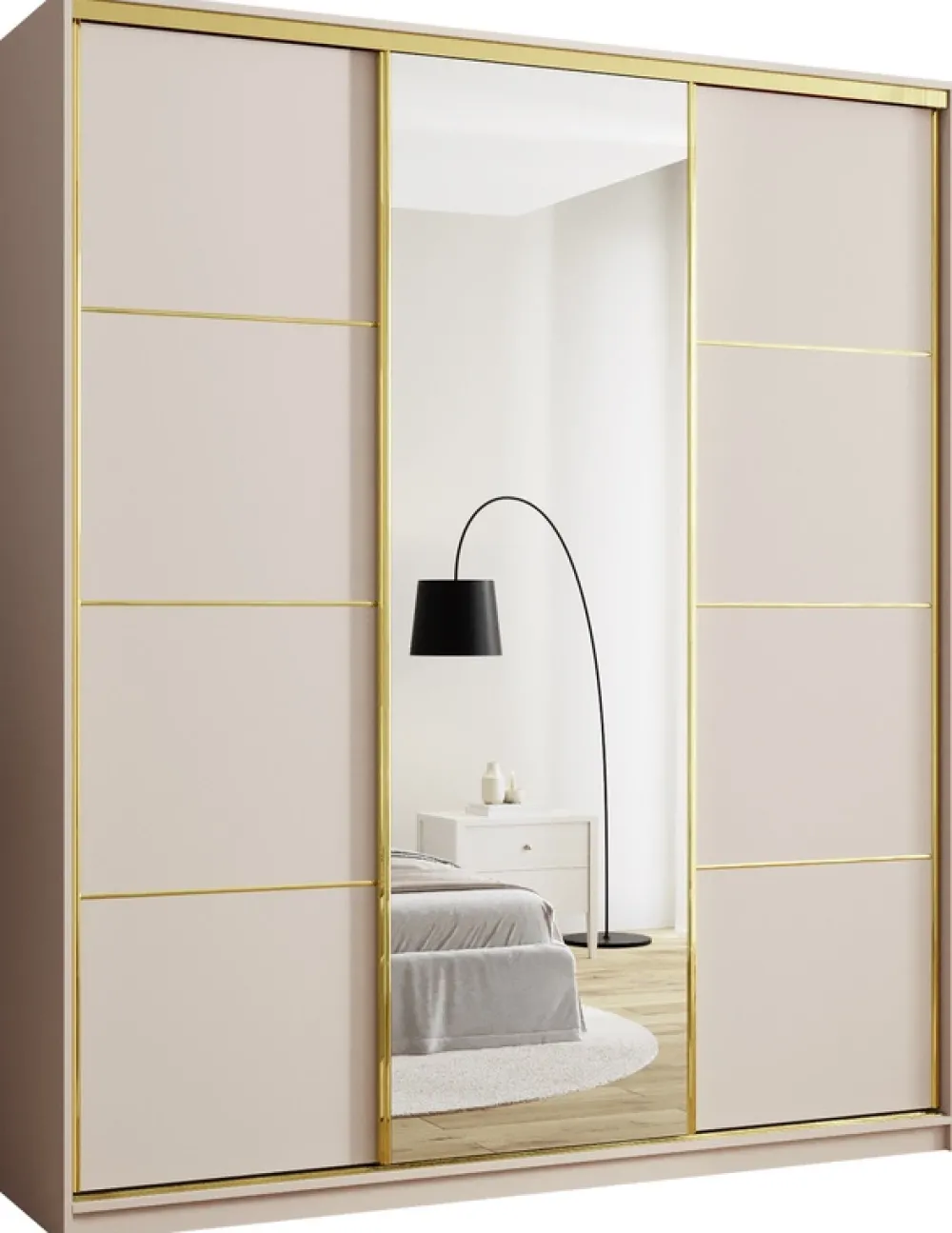 Wykończenie w kolorze złota to propozycja dla tych, którzy szukają nowoczesnego designu z nutą elegancji. Połączenie funkcjonalności i estetyki sprawia, że szafa idealnie wpisuje się zarówno w styl glamour, jak i minimalistyczne aranżacje.