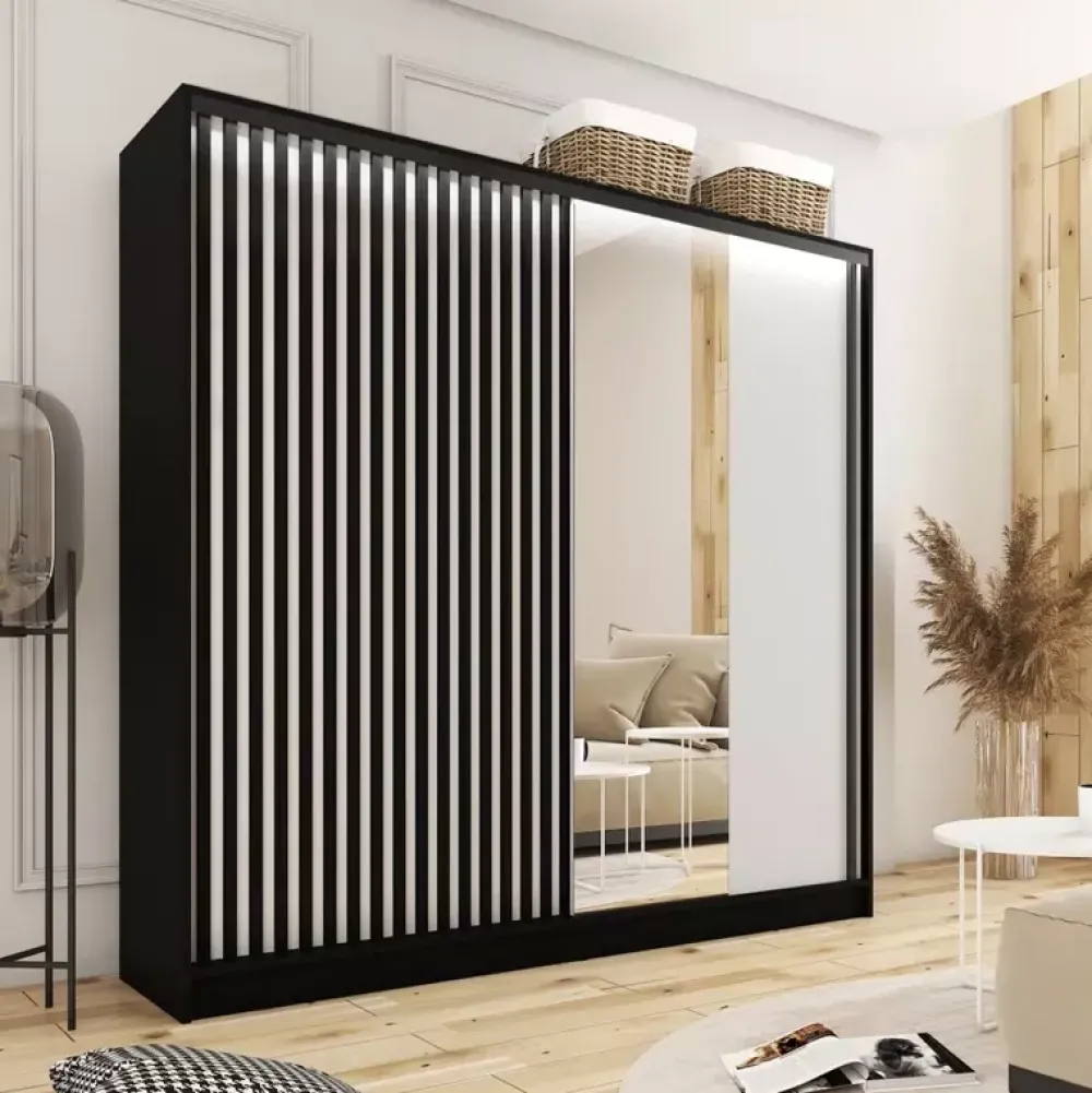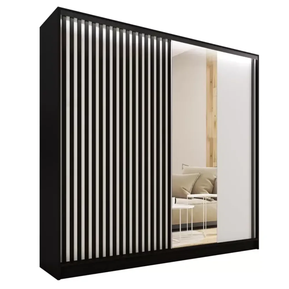 - Szafa niewyposażona w tradycyjne uchwyty, otwieranie odbywa się za pomocą listew przymocowanych do frontu.
