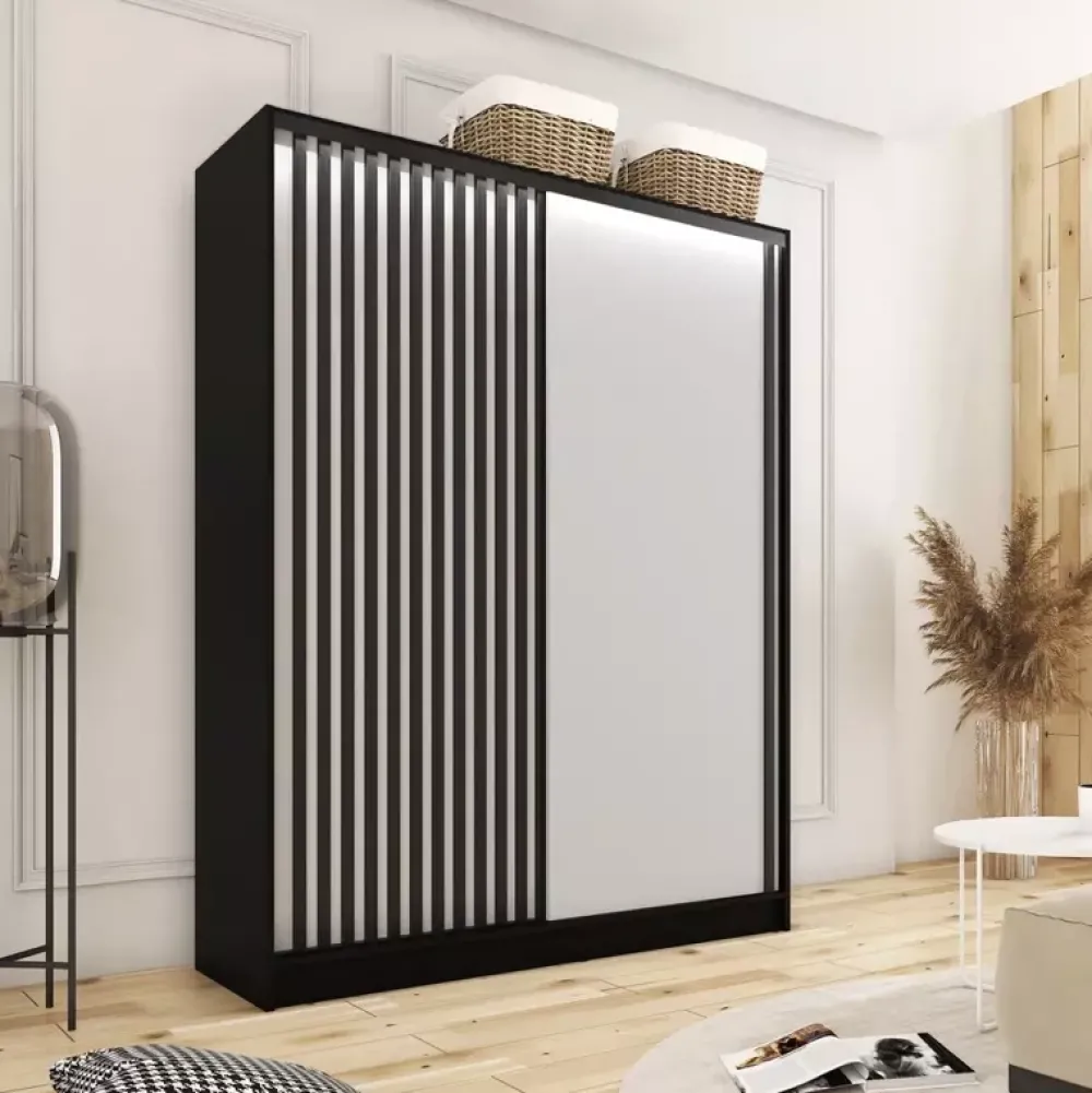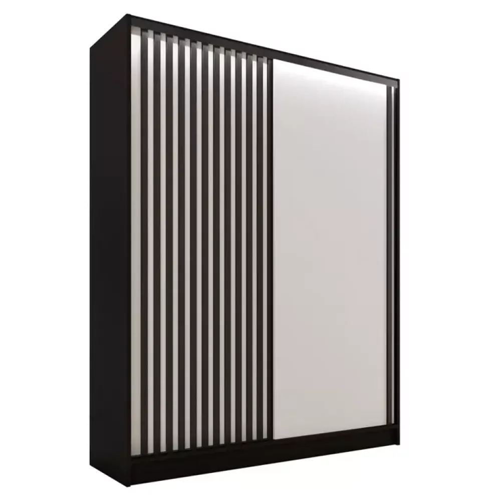 - Szafa niewyposażona w tradycyjne uchwyty, otwieranie odbywa się za pomocą listew przymocowanych do frontu.