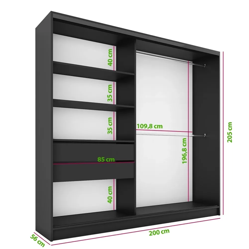 - Szafa przesuwna o szerokości 200 cm z wnętrzem zaaranżowanym z nastawieniem na jak największą swobodę użytkowania. Cztery duże półki, dwie szerokie szuflady oraz dwa drążki do samodzielnego nawiercenia, aby każdy mógł dopasować szafę do swoich potrzeb!
