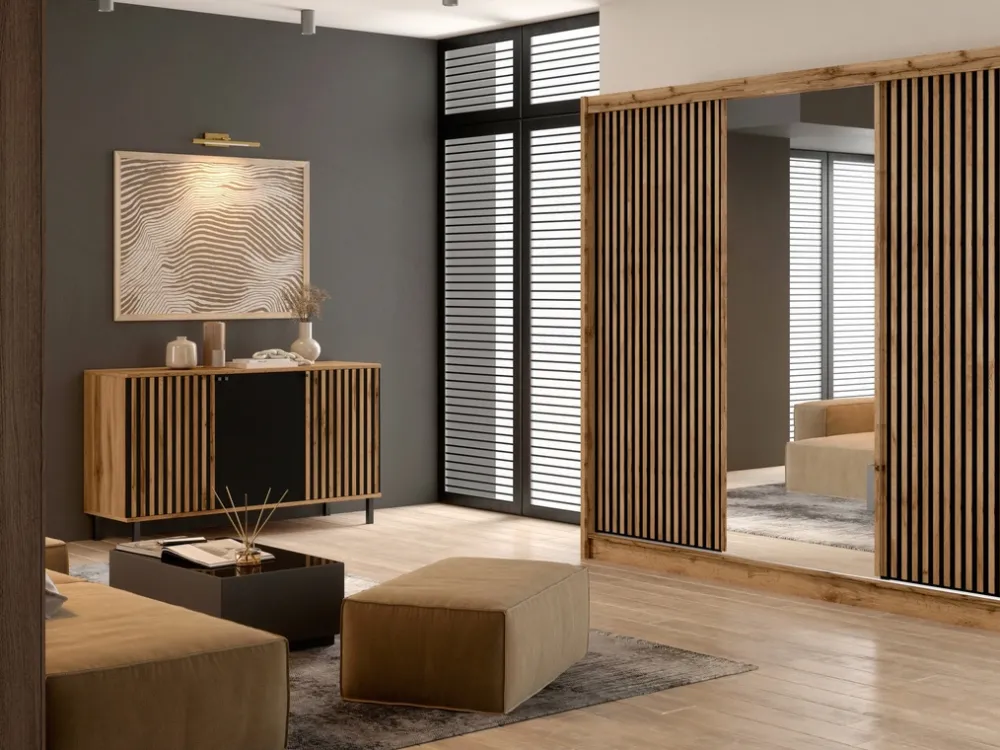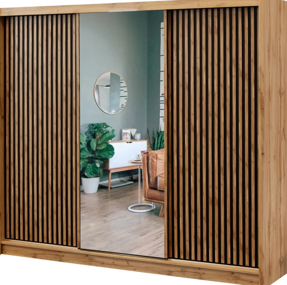 Szafa wyposażona jest w trzy przesuwne drzwi, co pozwala na wygodne otwieranie i zamykanie nawet w mniejszych pomieszczeniach. Dzięki temu oszczędzasz przestrzeń, jednocześnie mając pełen dostęp do zawartości szafy. Płynnie działający mechanizm drzwi sprawia, że codzienne użytkowanie szafy staje się przyjemnością.