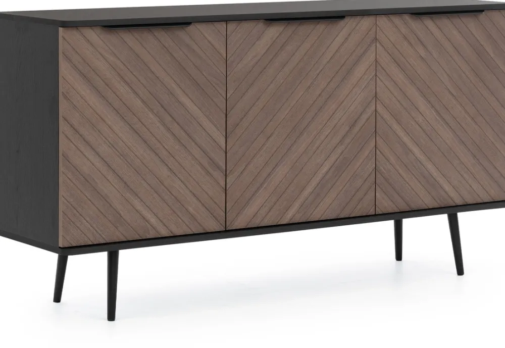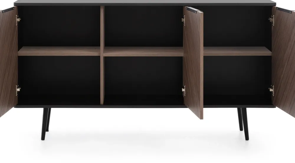 Każde z drzwi komody wyposażone są w czarne metalowe uchwyty, które doskonale komponują się z nóżkami, tworząc spójną i stylową całość. Uchwyty są ergonomiczne i wygodne w użytkowaniu, a ich minimalistyczny design wpisuje się w najnowsze trendy wnętrzarskie.