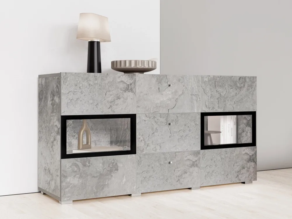 Industrialna komoda do salonu z oszklonymi drzwiczkami uchylnymi oraz szufladami