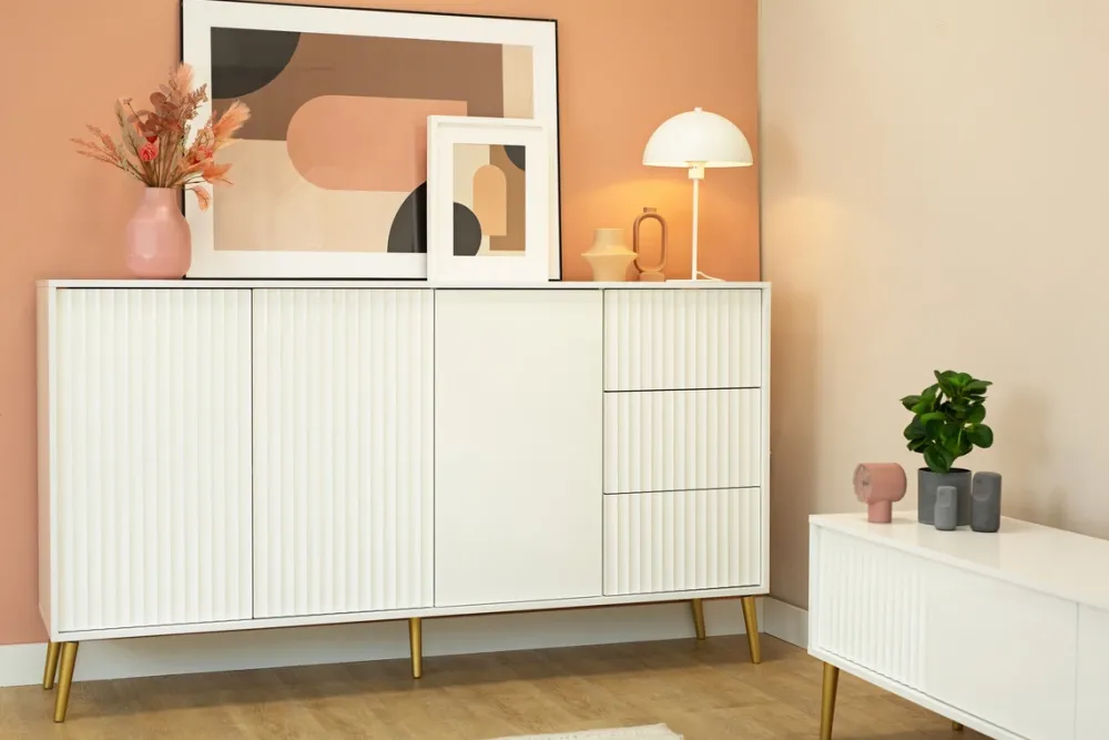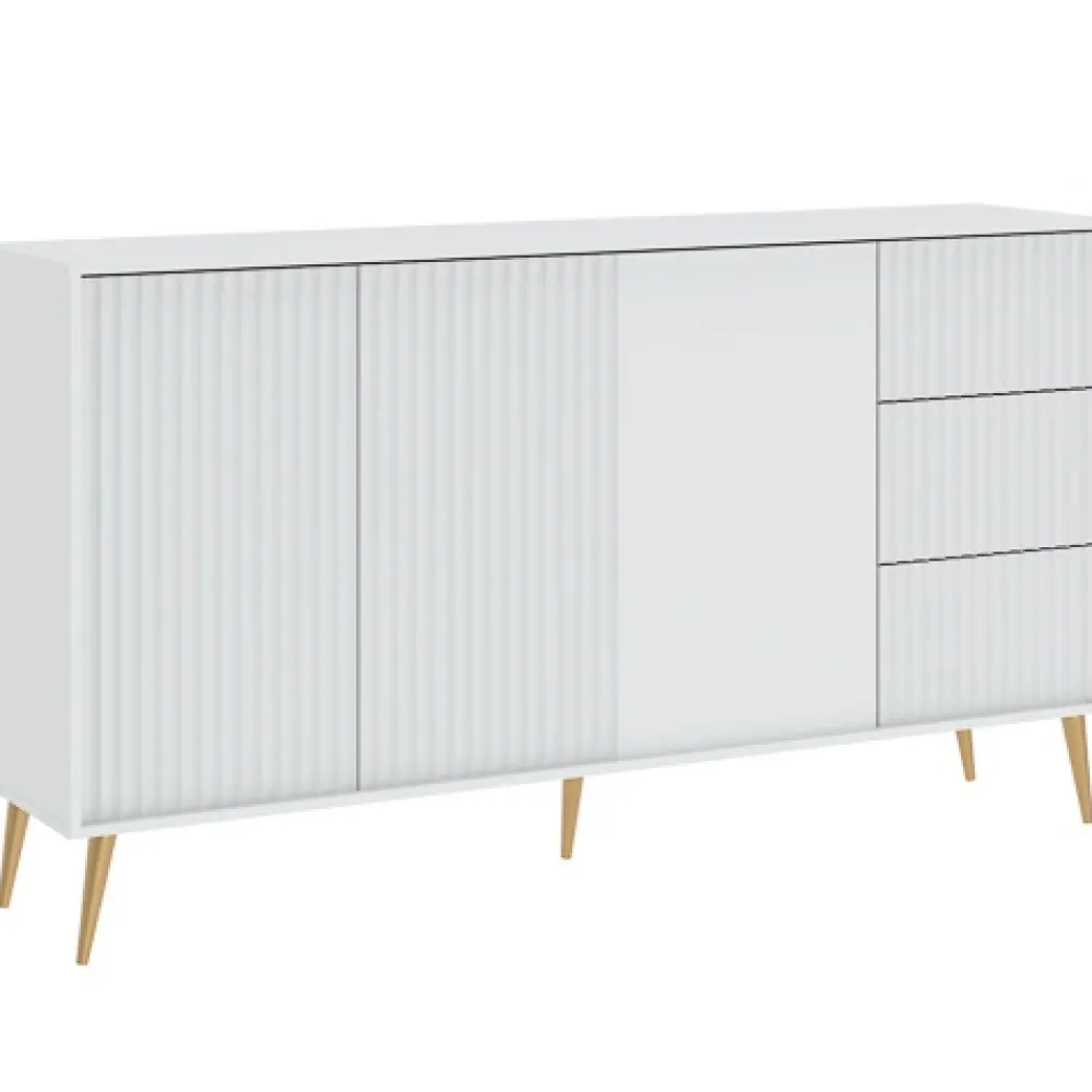 Szeroka komoda BELLUNO o długości 179 cm to stylowy akcent i funkcjonalne rozwiązanie do każdego nowoczesnego wnętrza. Połączenie białego koloru, ryflowanych frontów i smukłych metalowych nóg w odcieniu złotym tworzy mebel, który zachwyca estetyką i oferuje ogromną przestrzeń do przechowywania.