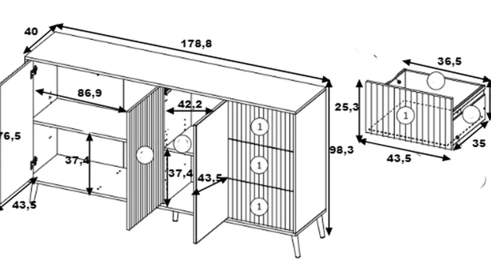 - Komoda z szufladami 180 cm BELLUNO posiada drzwi, za którymi można przechowywać rozmaite przedmioty i akcesoria, po prawej stronie znajdują trzy pojemne szuflady na akcesoria i nie tylko. Komoda posiada wysokie nóżki.