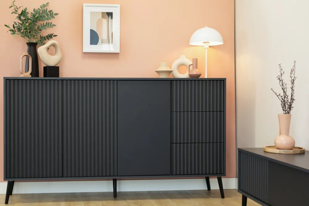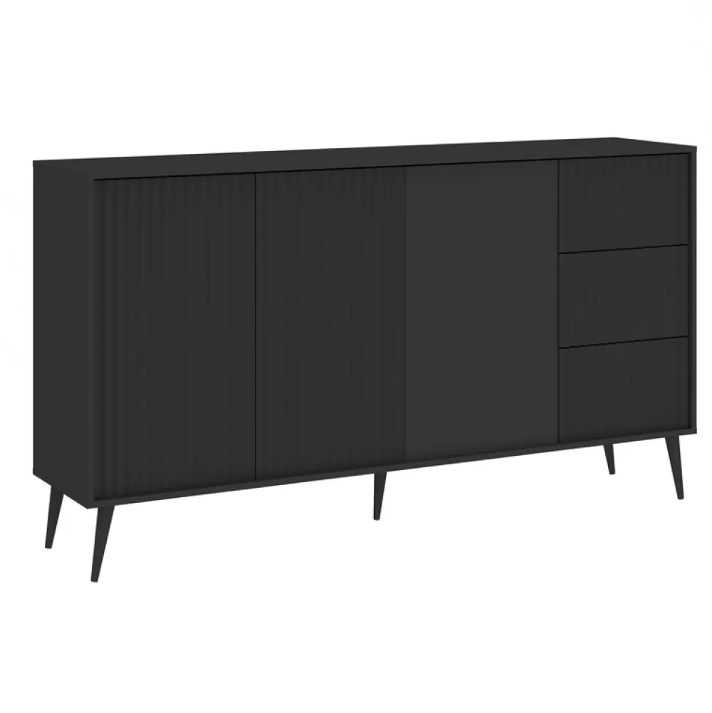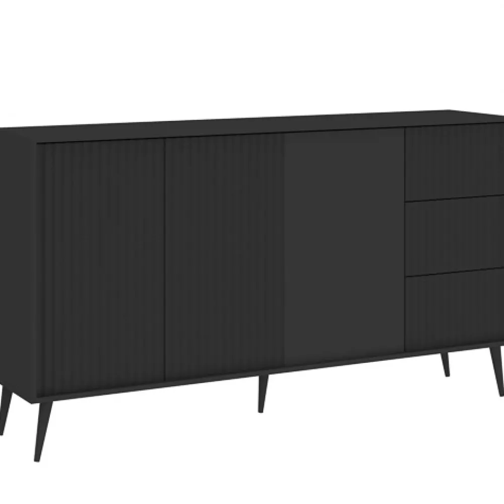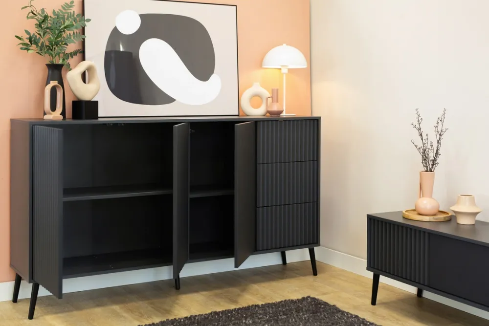 Szeroka komoda BELLUNO o długości 179 cm to stylowy akcent i funkcjonalne rozwiązanie do każdego nowoczesnego wnętrza. Połączenie antracytowego koloru, ryflowanych frontów i smukłych metalowych nóg tworzy mebel, który zachwyca estetyką i oferuje ogromną przestrzeń do przechowywania.