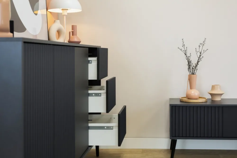 - Fronty z MDF z ryflowanym wykończeniem – elegancki akcent, który nadaje meblowi głębi