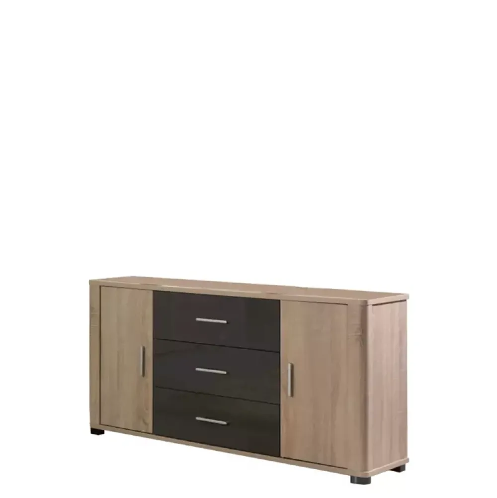 Pojemna komoda do salonu wyposażona została w trzy szuflady pracujące na prowadnicy kulkowej z pełnym wysuwem umieszczone w środkowej części mebla oraz dwie zamykane szafki, za którymi kryje się po jednej półce po zewnętrznych stronach.