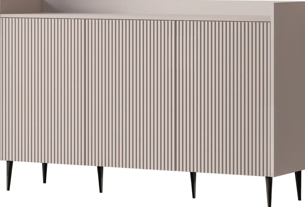 Jej ryflowane fronty, wykonane z płyty MDF, przyciągają uwagę interesującą fakturą, która łamie minimalistyczną formę i wprowadza do wnętrza dynamikę. Wysokie, czarne metalowe nóżki nadają meblowi lekkości i nowoczesnego charakteru, jednocześnie ułatwiając utrzymanie porządku pod komodą. Dzięki nim nowoczesna komoda na nóżkach ASPERO idealnie wpasowuje się we współczesne aranżacje i optycznie powiększa przestrzeń, co czyni ją świetnym wyborem nawet do mniejszych wnętrz.