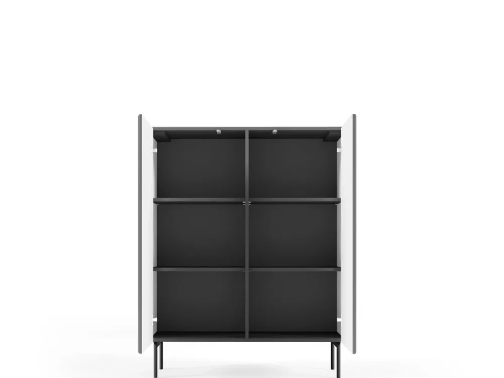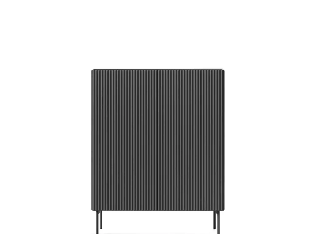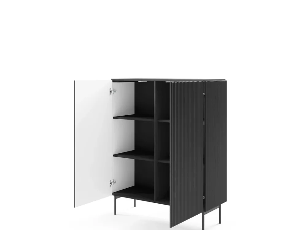 - Wysoka komoda MEZZO w kolorze czarnym z ryflowanym frontem i systemem push to open. Posiada sześć wnęk, metalowe nogi 18 cm, fronty i korpus z MDF oraz laminowanej płyty, obrzeże ABS. Nowoczesna, pojemna i elegancka.