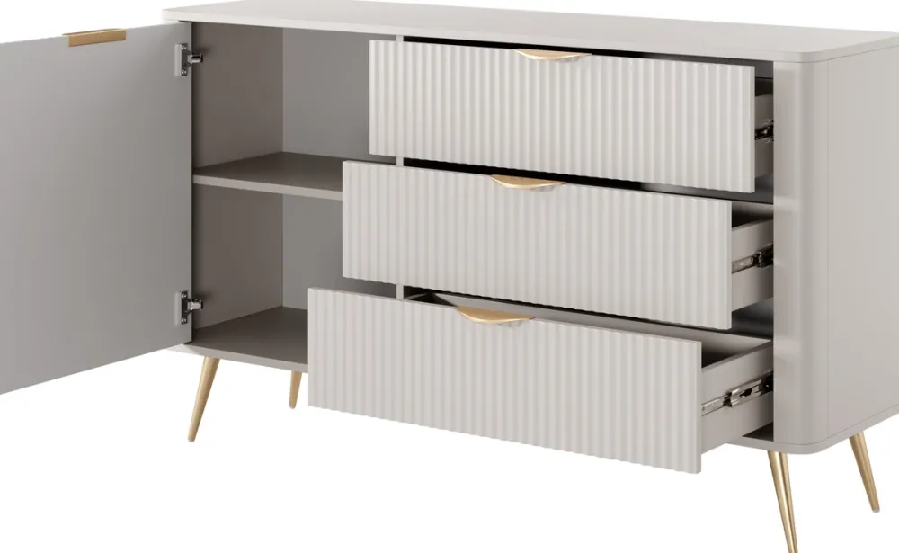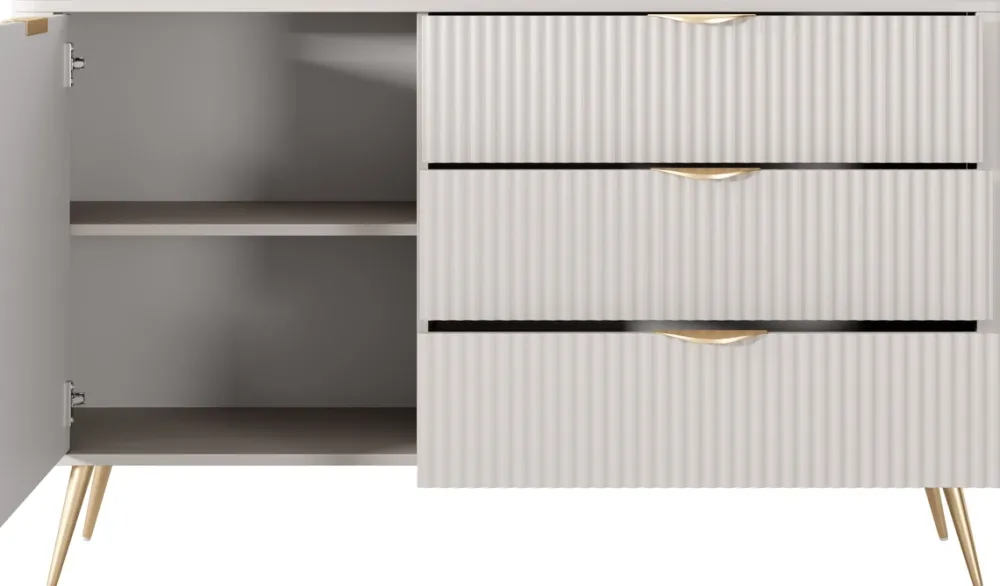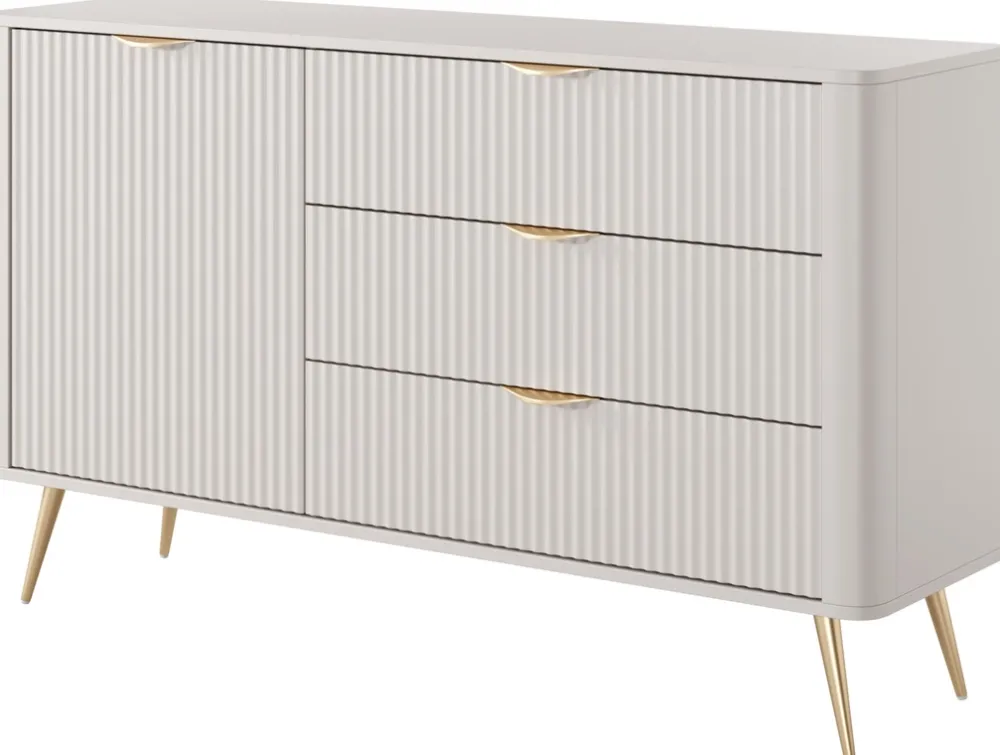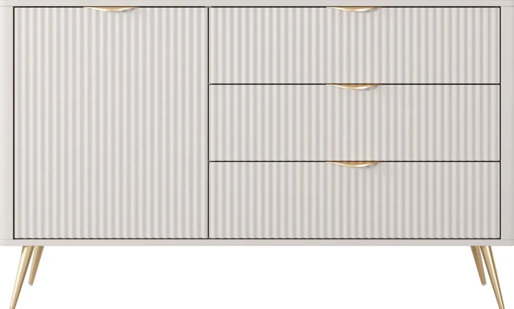 - Komoda LEONTE 138 cm w kolorze kaszmir z beżowymi frontami, 3 szufladami i szafką. Złote uchwyty i nogi podkreślają elegancki styl. Praktyczne przechowywanie i nowoczesny wygląd – idealna do salonu, sypialni lub przedpokoju.